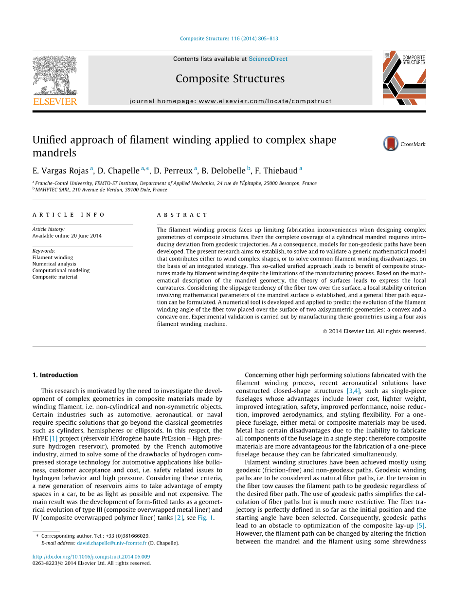当设计复合结构的复杂几何形状时,细丝缠绕工艺面临有限的制造麻烦。甚至圆柱形心轴的完整覆盖 都需要引入与测地线轨迹的偏差。结果,开发了非大地路径的模型。本研究旨在基于集成策略建立, 求解和验证有助于复杂形状缠绕或解决常见的灯丝缠绕缺点的通用数学模型。尽管制造工艺存在局限 性,但这种所谓的统一方法仍然可以使通过细丝缠绕制成的复合结构受益。基于心轴几何形状的数学 描述,表面理论导致表达局部曲率。考虑到纤维束在表面上的滑移趋势,建立了包含心轴表面数学参 数的局部稳定性判据,并可以建立一般的纤维路径方程。开发了一种数值工具,并将其应用于预测放 置在两个轴对称几何形状(凸形和凹形)表面上的纤维束的细丝缠绕角度的演变。通过使用四轴长丝 缠绕机制造这些几何形状来进行实验验证。