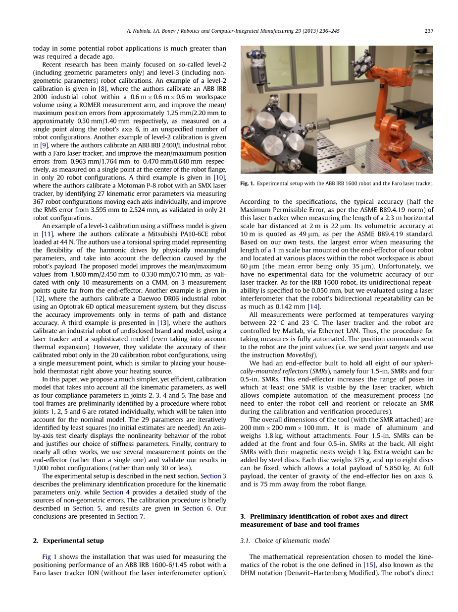 最近的研究主要集中在所谓的2级(只包括几何参数)和3级(包括非几何参数)机器人校准。从中[8]给出了一个二级校准的例子,使用ROMER测量臂测量将ABB IRB 2000工业机器人校准在0.6m*0.6m*0.6 m的工作空间体积,并将平均/最大位置误差从大约1.25 mm/2.20 mm分别提高到大约0.30 mm/1.40 mm,测量点沿机器人轴线6,但未指定机器人配置的数量。其中二级标定的另一个例子[9],校准一个ABB IRB 2400 / L工业机器人法激光跟踪器,并改善均值/最大位置错误从0.963mm/ 1.764mm到0.470mm/ 0.640mm分别衡量在一个单点的中心机器人法兰,在只有20机器人配置。第三个例子[10]中,在校准Motoman机器人这种SMX激光跟踪器,367个机器人通过识别27日运动误差参数通过测量机器人单独配置每个轴运动,和完善均方根误差从3.595mm到2.524mm,只有21个机器人配置验证。