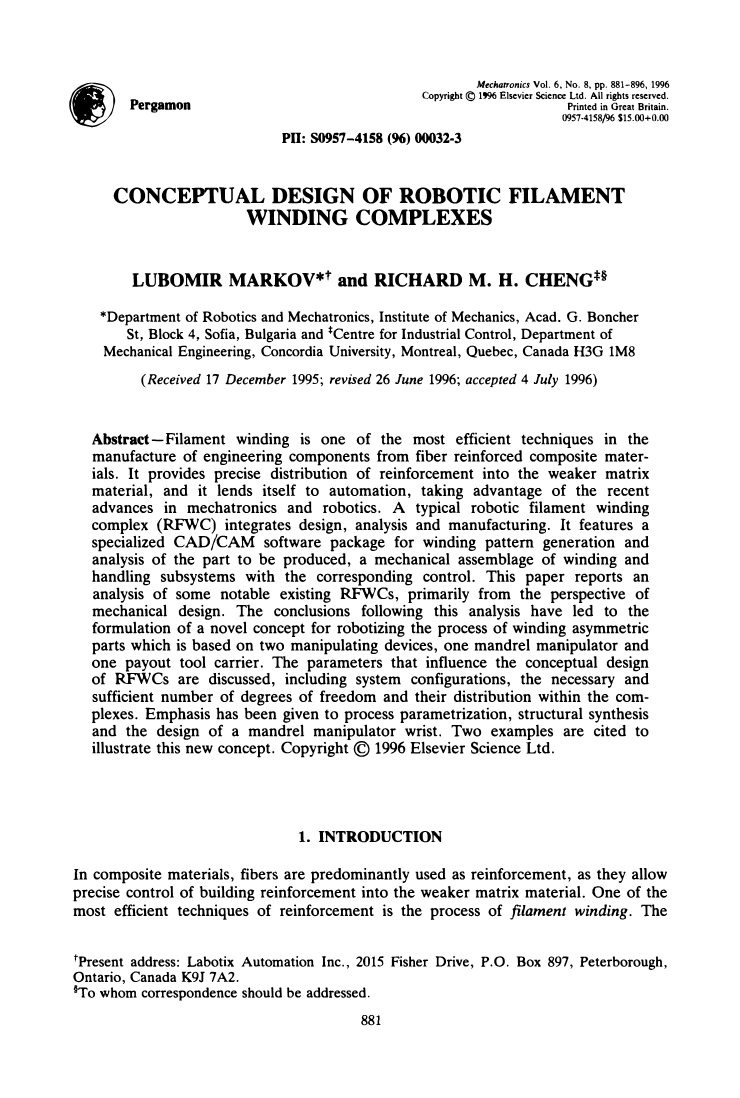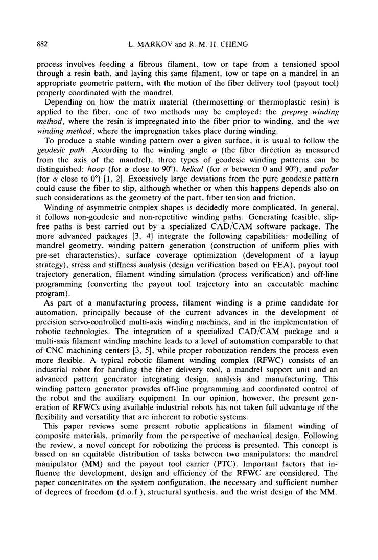 Bernard等人讨论了有关机器人纤维缠绕的CAD/CAM方法,RFWC的最佳配置以及使用输送机输送芯模的可能性,还描述了一种使用热固性树脂预浸带缠绕不对称部件的机器人单元。它由六自由度的机器臂和一个带有垂直旋转轴的单自由度芯模支撑单元组成。