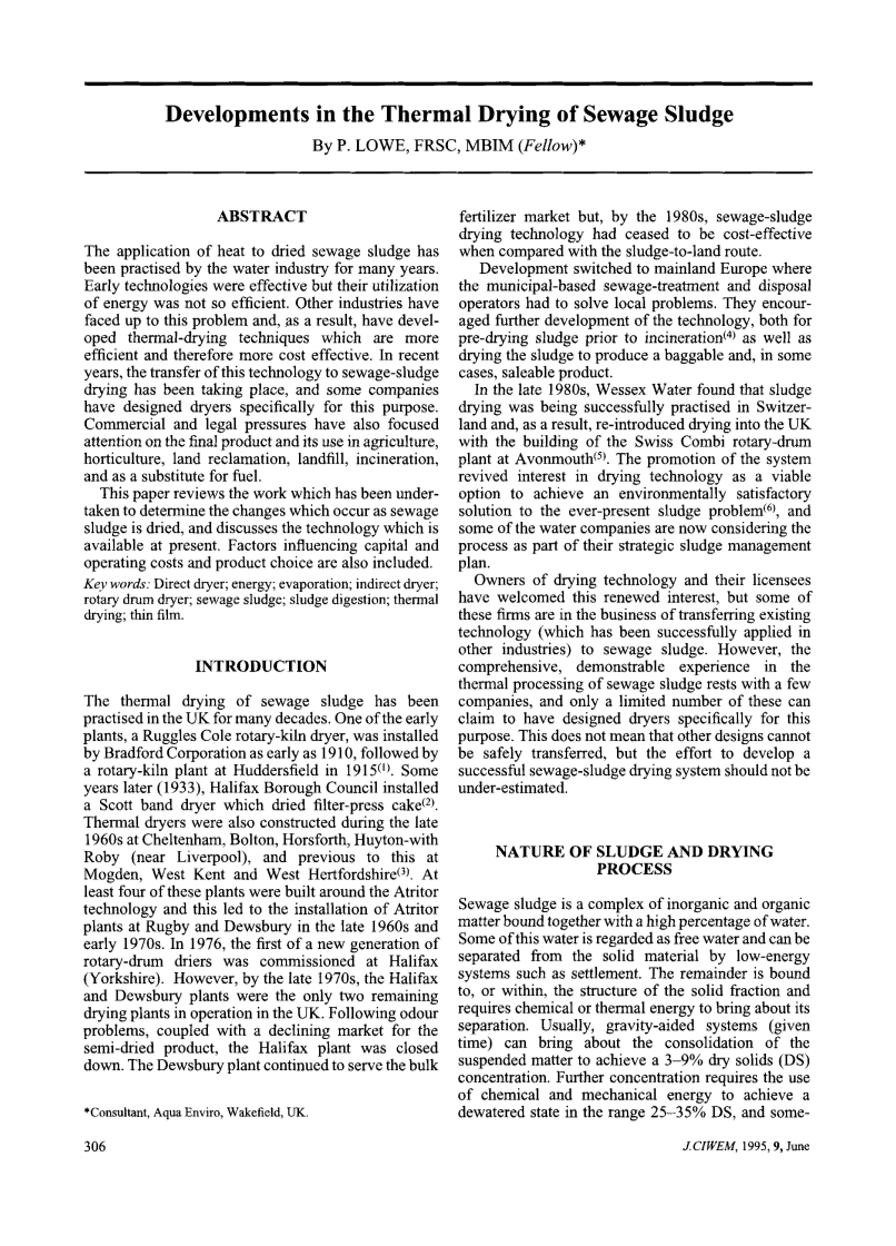 在1980年后期,韦塞克斯水公司发现污泥干燥在瑞士已经成功地进行了,因此,随着瑞士联合旋转滚筒工厂的建立,污泥干燥又重新引入英国。epromotionofthesystem重新唤起了人们对干燥技术的兴趣,将其作为一种可行的选择,以实现对一直存在的污泥问题的环境满意的解决方案(6),一些水公司现在正在考虑将该过程作为其污泥战略管理计划的一部分。