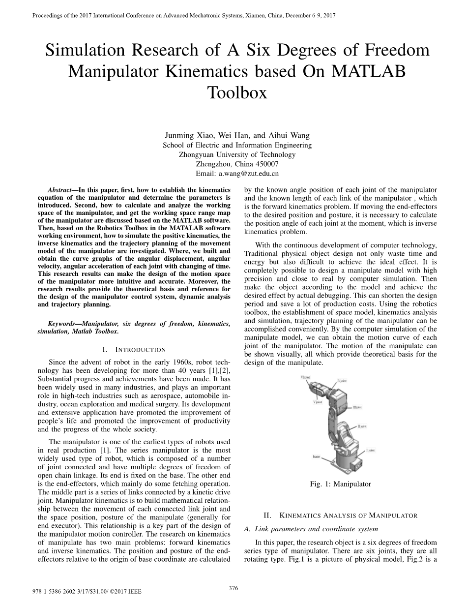 Keywords:Manipulator, six degrees of freedom, kinematics, simulation, Matlab Toolbox.