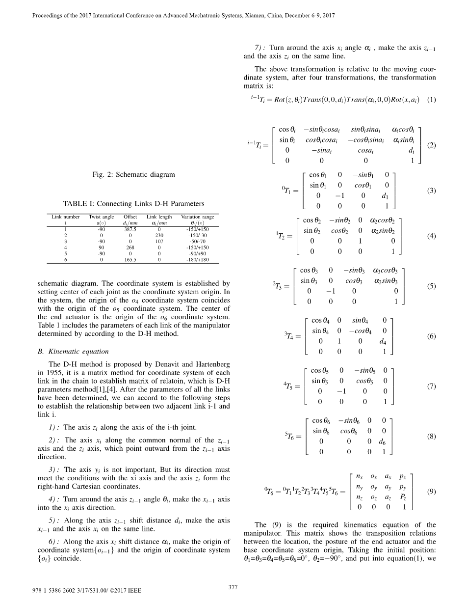 i-1Ti=Rot(zi-1,theta;i)Trans(0,0, di) Trans(ai,0, 0) Rot(xi, alpha;i) (1)