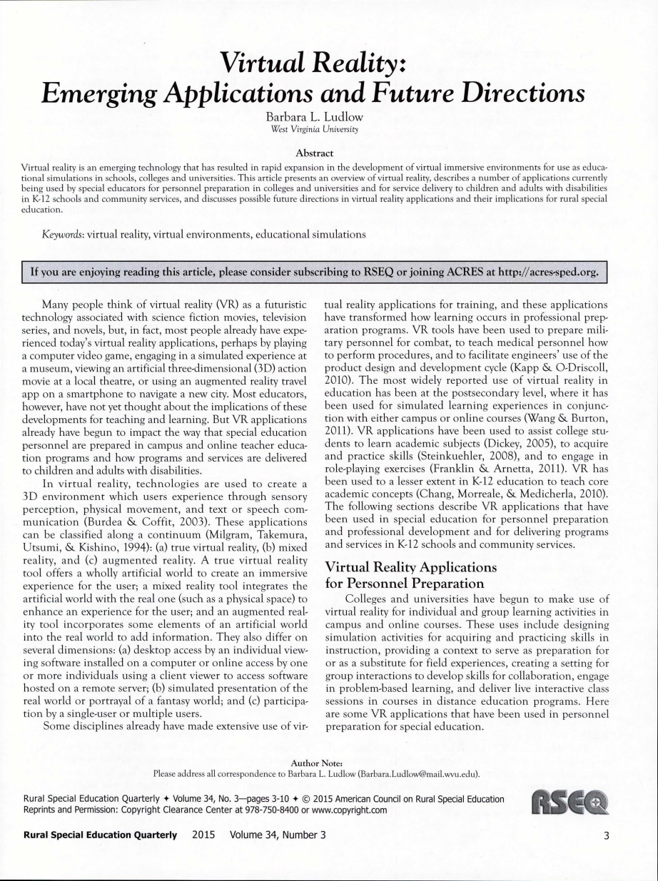 许多人认为虚拟现实(VR)是一个与科幻电影、电视剧、小说有关的未来技术。但是,事实上大多数人已经体验过今天的虚拟现实应用,也许通过玩电脑游戏、在一个博物馆参与一个模拟的经验、在当地的剧院观看一个人造的三维(3D)动作电影或在智能手机上使用一个增强现实的旅行应用软件来观察一个新的城市。然而大多数教育工作者还没有想到这些经历对教学的意义。但VR应用程序早已开始影响校园里的特殊教育人员的编制和在线老师教育节目以及如何规划和服务于残疾儿童和成人的方式。
