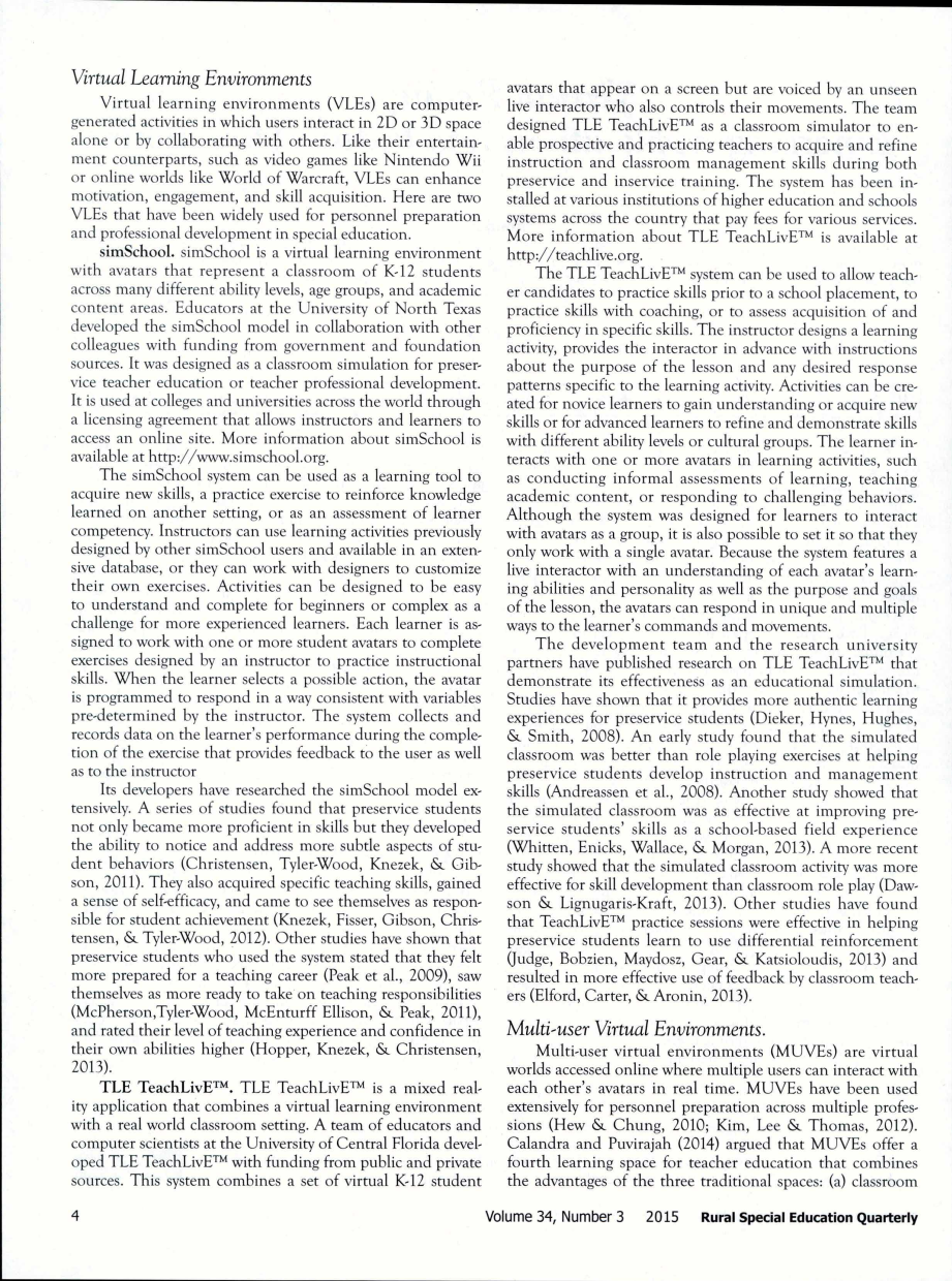 多用户虚拟环境(MUVEs)是多个虚拟世界在访问,在该环境中多用户可以实时地与他们的化身进行相互作用。MUVEs已经广泛用于跨多个专业的人员准备。卡兰德拉和Puvirajah认为MUVEs提供一个结合三个传统空间的优点的第四学习空间给教师教育:(a)课堂讲座;(b)课堂练习训练;(c)在真实学校的场所体验。有两种MUVEs已经被用于特殊教育的人员准备。