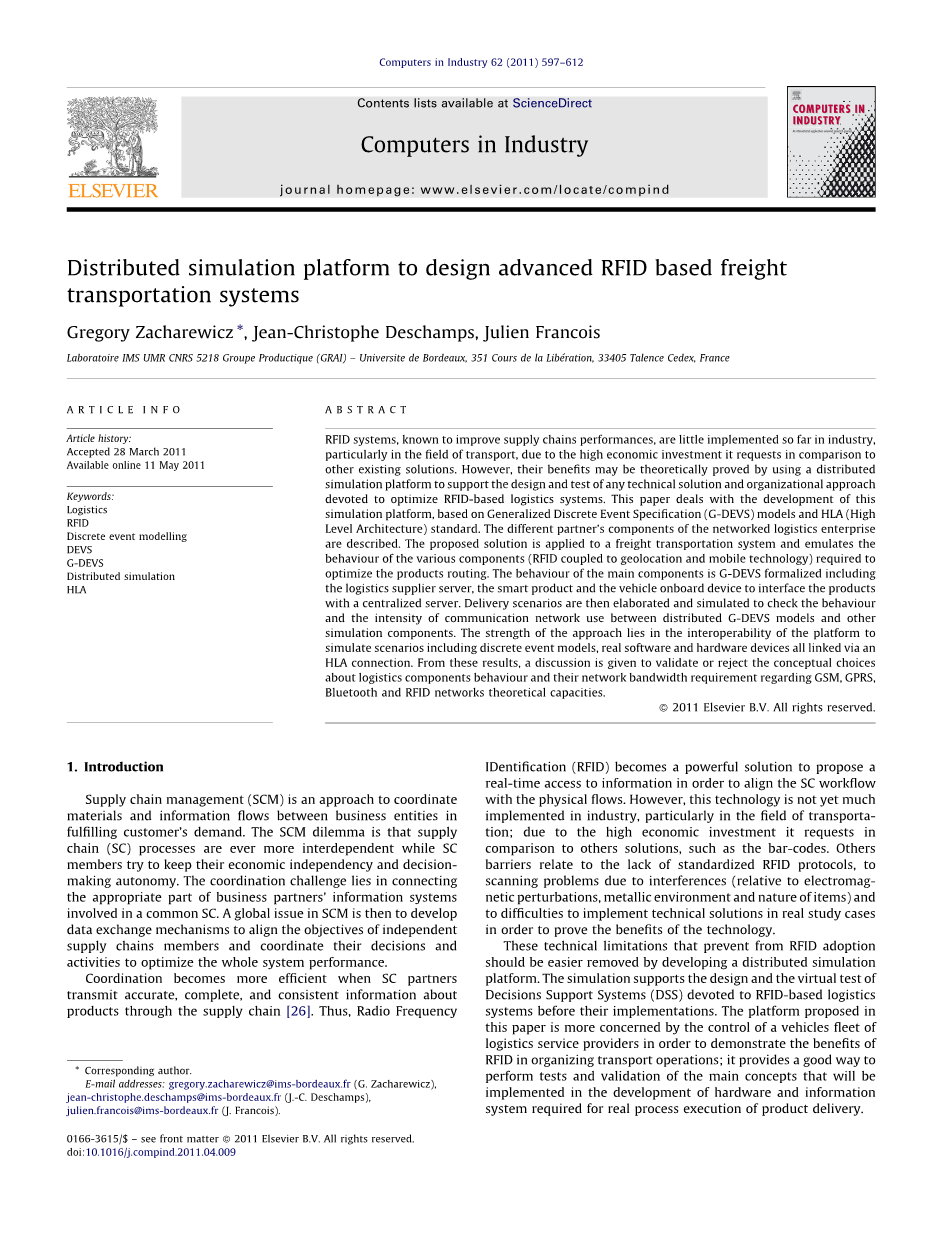 摘 要:RFID系统,众所周知可以提高供应链的表现,至今都很少在工业中发展实施,特别是在运输领域,因为相比现有的解决方案需要更高的经济投资。然而,通过使用支持任何为改善RFID物流系统的技术方案和组织方式的设计和测试的分布式仿真平台,他们的好处理论上可以得到证明。本文从这种仿真平台的发展展开论述,基于广义离散事件规范(G-DEVS)模型和HLA(高层体系结构)标准。网络化物流企业的不同组成部分将被描述。所提出的方案可应用于货运系统和模拟优化产品路由所需的各种部件(RFID与地理定位和移动技术耦合)的行为。主要组件的行为是G-DEVS形式化的,包括物流供应商的服务器,智能产品和作为产品与中央服务器接口的车载设备。递送情景将被详细描述和模拟,以检查分布式G-DEVS模型和其他模拟组件之间的运行状况和使用的通信网络强度。该方法的优点在于平台上模拟场景的互操作性,包括离散事件模型,真实的软件和硬件设备都通过HLA连接。通过这些结果,关于物流组件的运行状况和他们的网络带宽要求,将给出一个讨论来验证或否定概念上的选择,涉及GSM,GPRS,蓝牙和RFID网络的理论能力。
