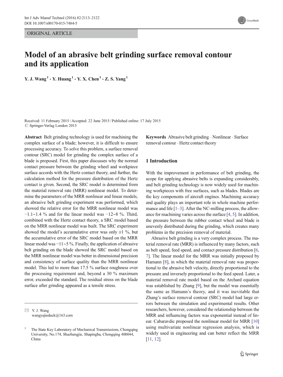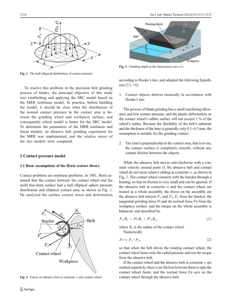 随着皮带磨削性能的改善,适用于研磨带的范围扩大,和砂带磨削技术现在广泛用于机带有自由表面的工件,如刀片叶片飞机发动机的关键部件。加工精度在整机性能和质量起着重要的作用。数控铣削工艺后,允许橡胶接触轮与叶片之间的压力是在研磨过程中分配不均匀,这将创造许多材料精密去除中存在的问题。磨粒磨削是一个非常复杂的过程。材料去除率(MRR)受许多因素的影响,如由于皮带速度,进给速度和接触压力分布,对MRR的线性模型是最初提出的哈曼,其材料去除率成正比与砂带速度、直接成正比压力和进料速度成反比。后来,基于Archard方程的材料去除率模型成立,但该模型基本上是和哈曼的理论一样,这是不可避免的表面去除轮廓(SRC)模型已经大二—仿真和实验结果之间的误差。其他研究人员,但是,认为之间的关系MRR和影响因素是不是林指数耳朵。cabaravdic提出MRR 非线性模型采用多元非线性回归分析法在工程中的广泛应用,能更好地反映材料。