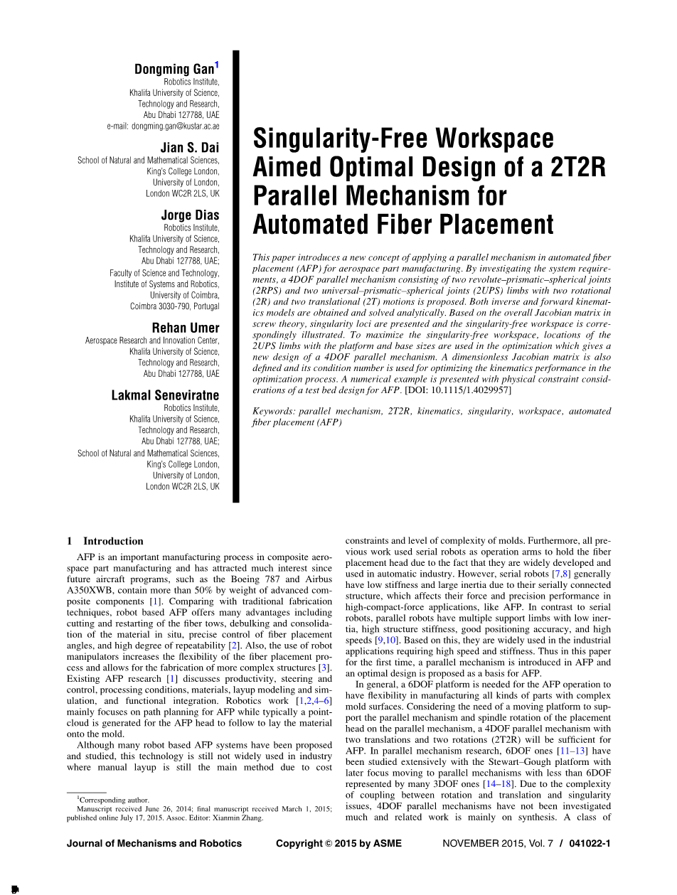 本文介绍了一种在航空零件制造领域运用并联机构的自动纤维铺放技术(AFP)的新概念。通过调查系统需求,一个四自由度的并联机构由两个转动-棱柱-球形接头(2RPS)和两个通用-棱柱-球形关节(2UPS)(可分解成两个转动(2R)和两个平移(2T)运动)组成。机构的逆向和正向运动学模型都经过了分析研究,基于总体雅可比矩阵螺旋理论,奇点轨迹得以展现,并且自由奇点的工作空间能被准确的阐释。为最大限度的提高自由奇点的工作空间,对2UPS的平台和底座的位置尺寸进行优化,这给了四自由度并联机构一个新设计。无量纲雅可比矩阵也被定义,并且他的条件数通过优化运动学性能来优化过程,从而为AFP设计一个呈现物理限制因素的数字模拟试验台。