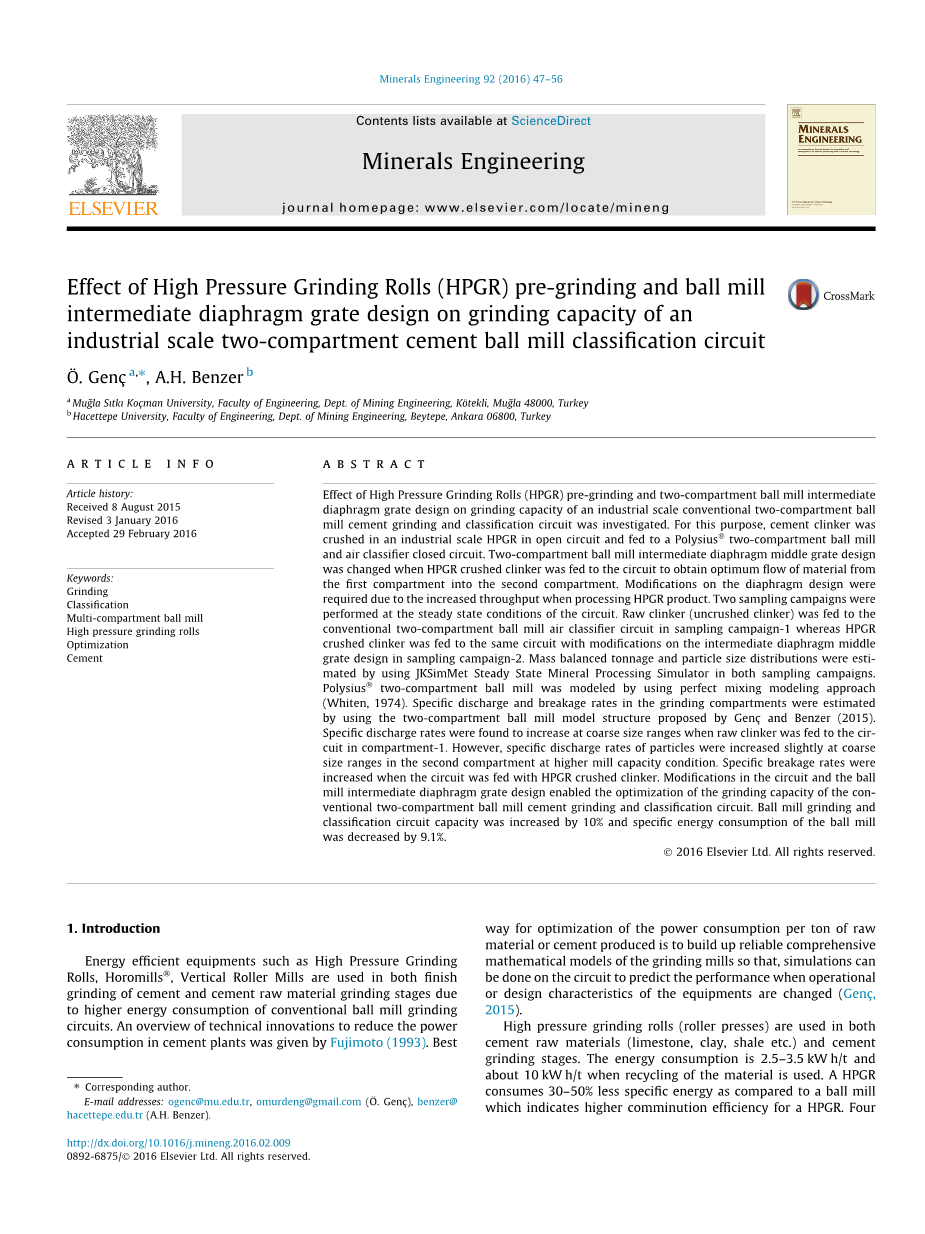 高压辊磨机的影响(HPGR)预磨和一种工业规模的双室水泥磨球机分级电路磨球机中间隔板的设计