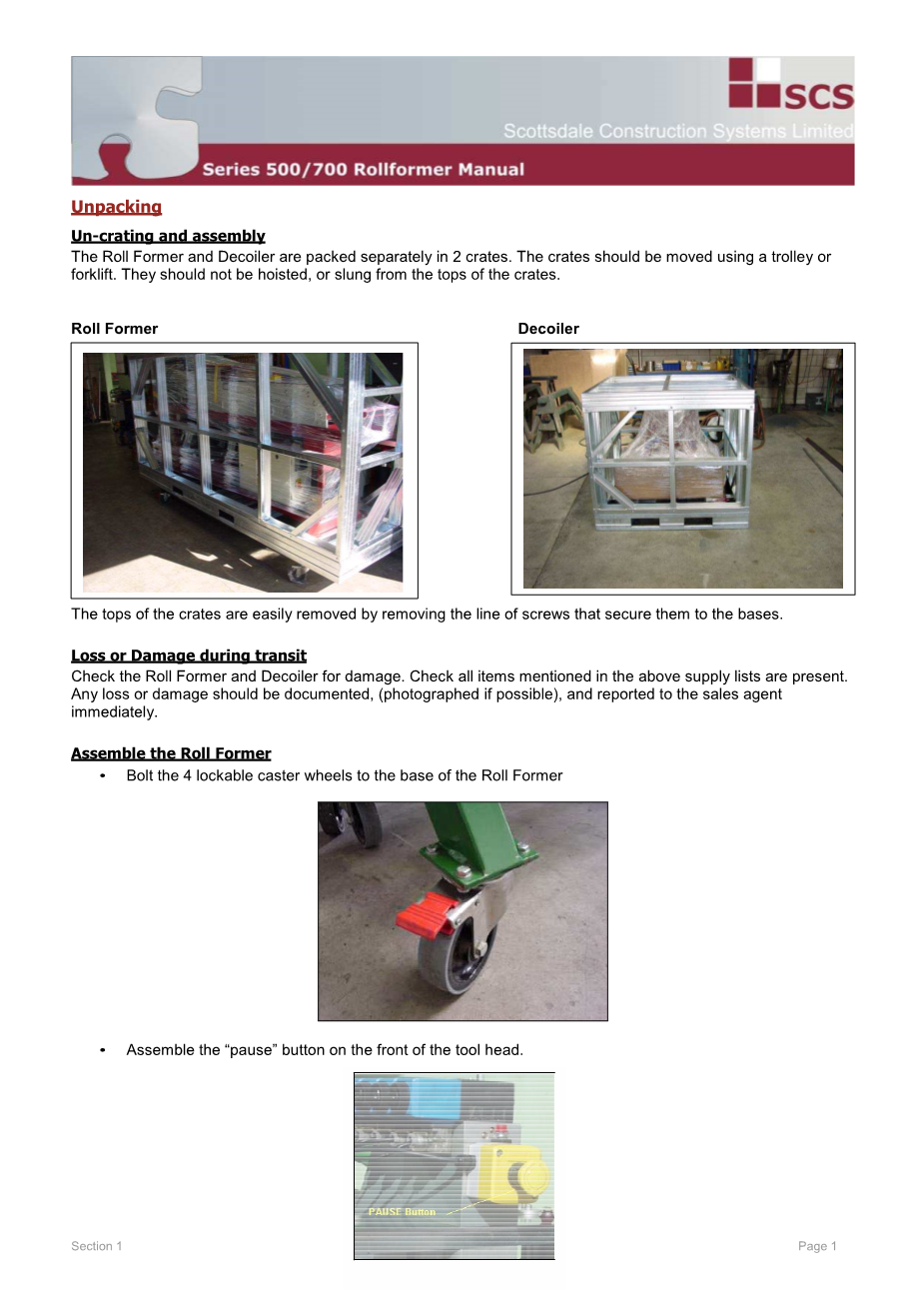 推动开卷机以与轧辊成型机排列线圈并锁定砂轮。