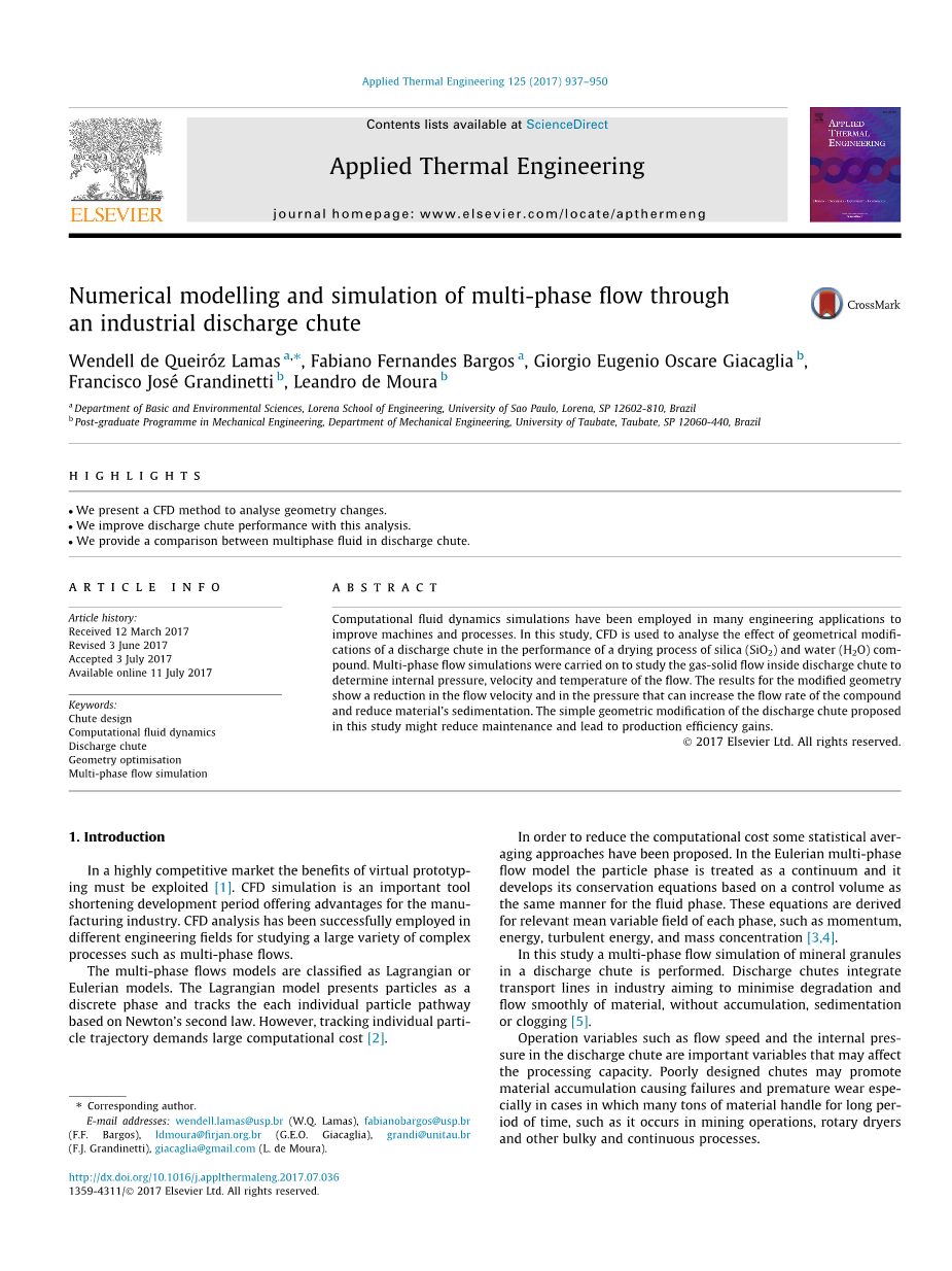 本文对二氧化硅(SiO2)和水(H2O)复合干燥过程中的出料溜槽进行了多相流动模拟。确定了溜槽内的流速、压力、温度等运行参数。提出了一种改进的几何形状,旨在降低溜槽内的流速和压力,增加流速,减少物料沉降。