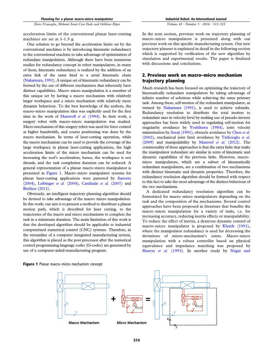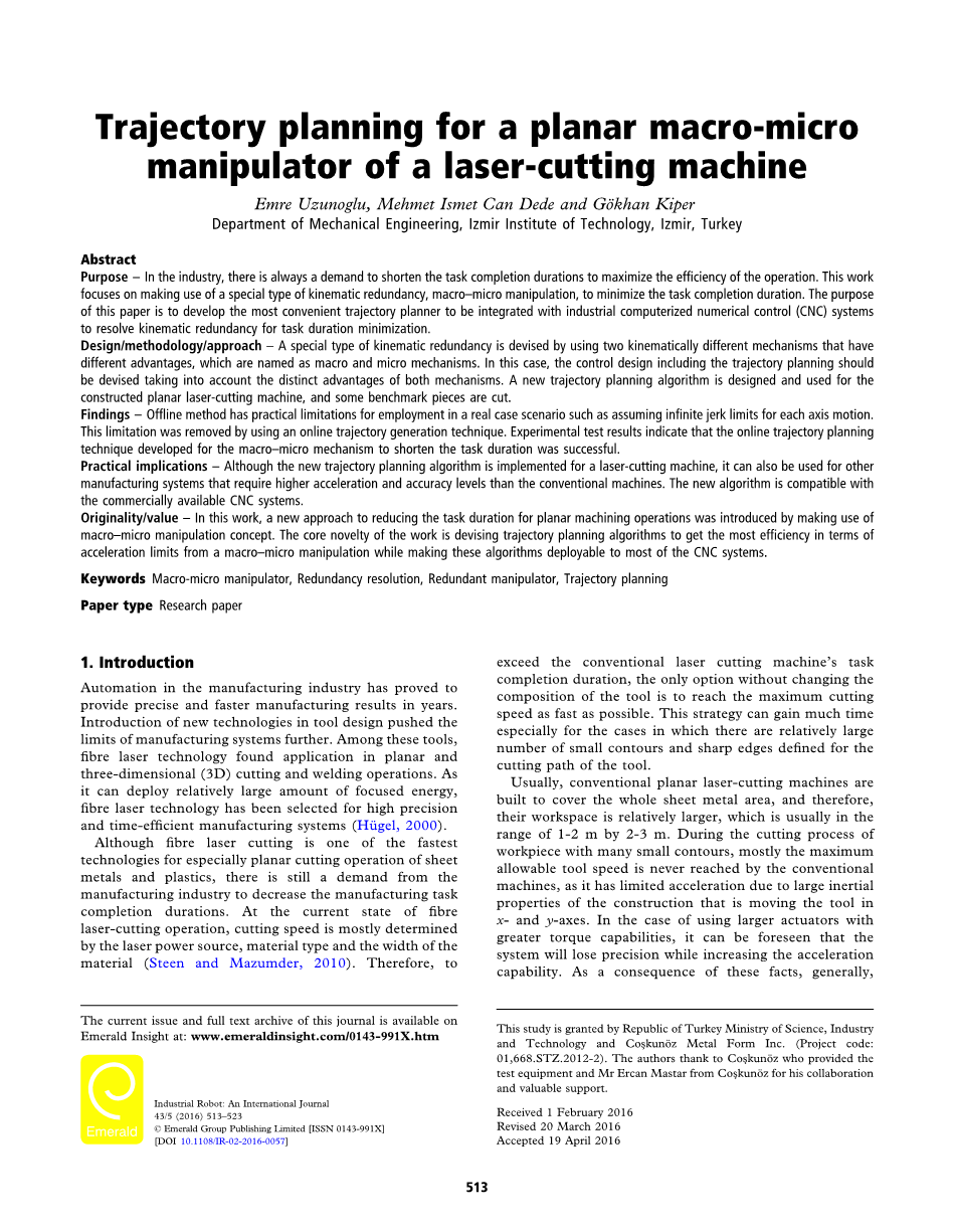 设计/方法/方式– 主要利用两种具有不同优点的运动学机构,即宏观机构和微观机构,设计了一种特殊类型的运动学冗余。在这种情况下,在设计包括轨迹规划在内的控制设计时,应考虑两种机构的不同优势。针对所构造的平面激光切割机,设计并实现了一种新的轨迹规划算法,并对一些基准零件进行了切割。