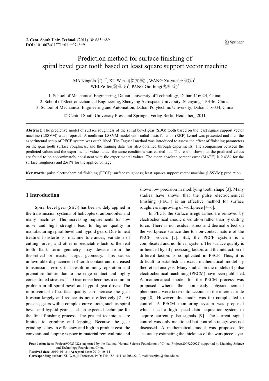 关键词:脉冲电化学抛光(PECF);表面粗糙度;最小二乘支持向量机(LSSVM);预测