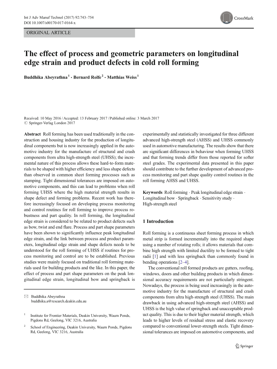 关键词:轧辊成形。 峰值纵向边缘应变。纵向弯曲。弹性后效。 灵敏度研究。高强度钢