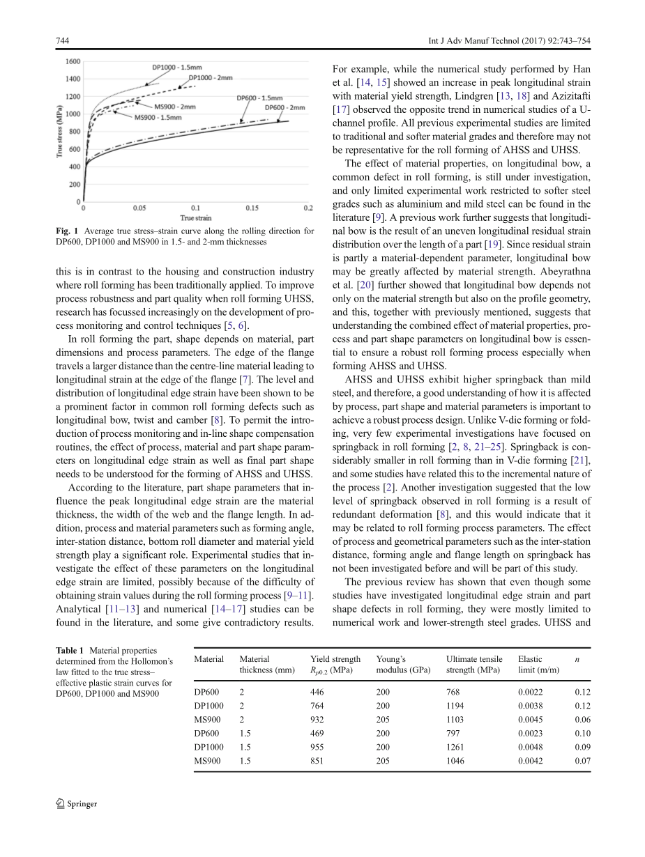 材料性能对纵向弯曲的影响,这是轧辊成形中的一个常见缺陷,目前仍在研究中,只有有限的实验工作限于较软的钢种,如铝和低碳钢,可在文献[9]中找到。以前的工作进一步表明,纵向弯曲是一个零件长度上纵向残余应变分布不均的结果[19]。由于残余应变部分是材料依赖参数,所以纵向弯曲可能受材料强度的很大影响。 Abeyrathna等人[20]进一步表明,纵向弯曲不仅取决于材料的强度,而且还取决于轮廓的几何形状,这与前面提到的一样,表明理解材料属性,工艺和零件形状参数对纵向弯曲的综合影响是至关重要的确保成型过程稳定,特别是在形成AHSS和UHSS时。