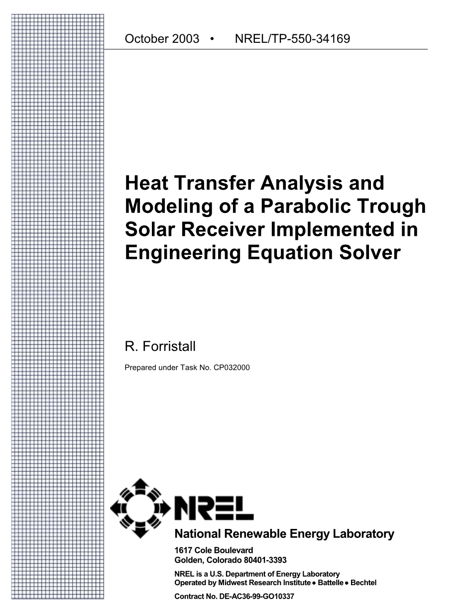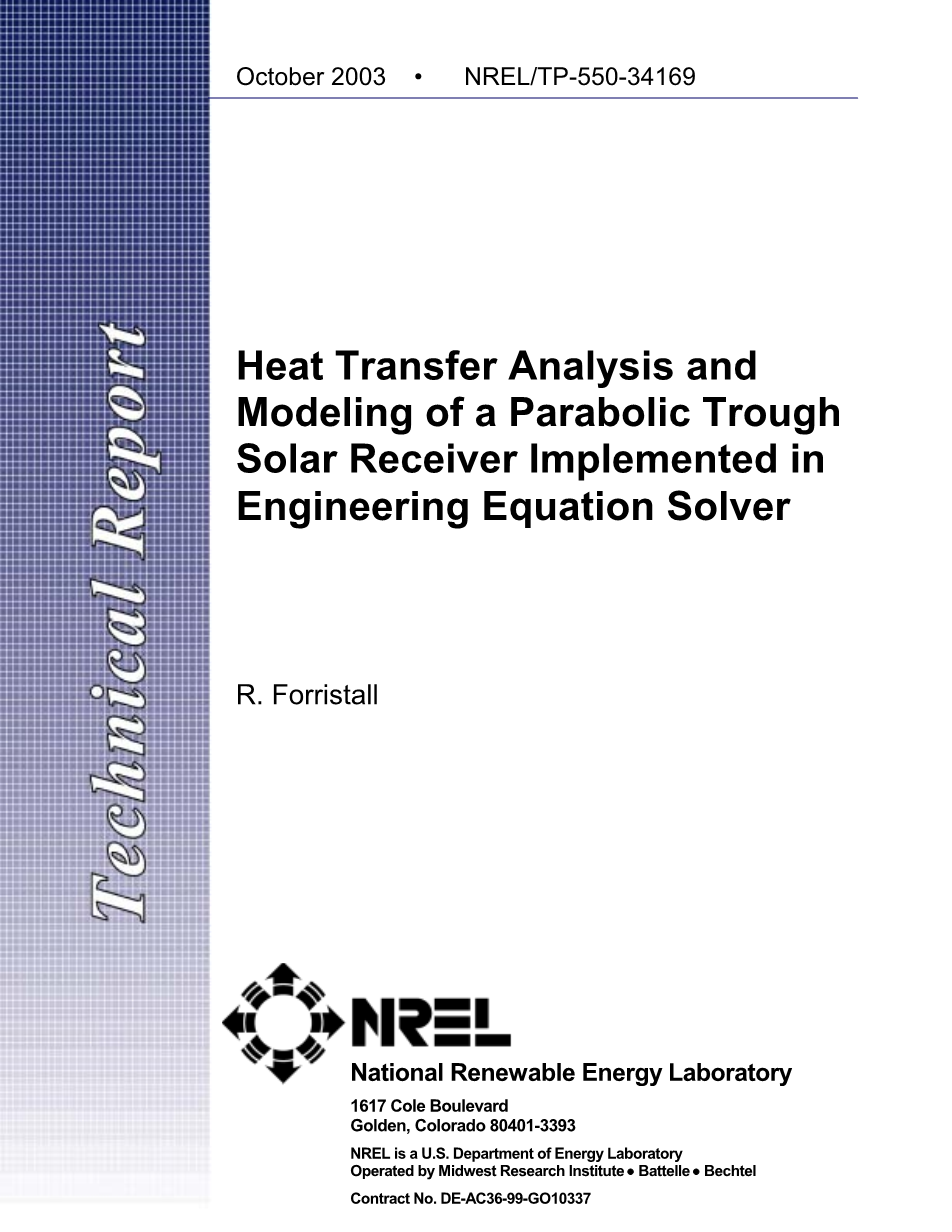 本报告描述了在工程方程求解器(EES)中实施的传热模型的开发,验证和使用。该模型决定了抛物线槽式太阳能集热器线性接收器的性能,也称为集热器元件(HCE)。讨论了模型中使用的所有传热和热力学方程,光学性质和参数,以及所有模型输入和输出。 输入包括收集器和HCE几何结构,光学特性,传热流体(HTF)特性,HTF入口温度和流量,太阳入射强度,风速和环境温度; 输出包括收集器效率,HTF出口温度,热量增益以及热量和光学损耗。 还讨论了建模假设和限制,以及对模型改进的建议。