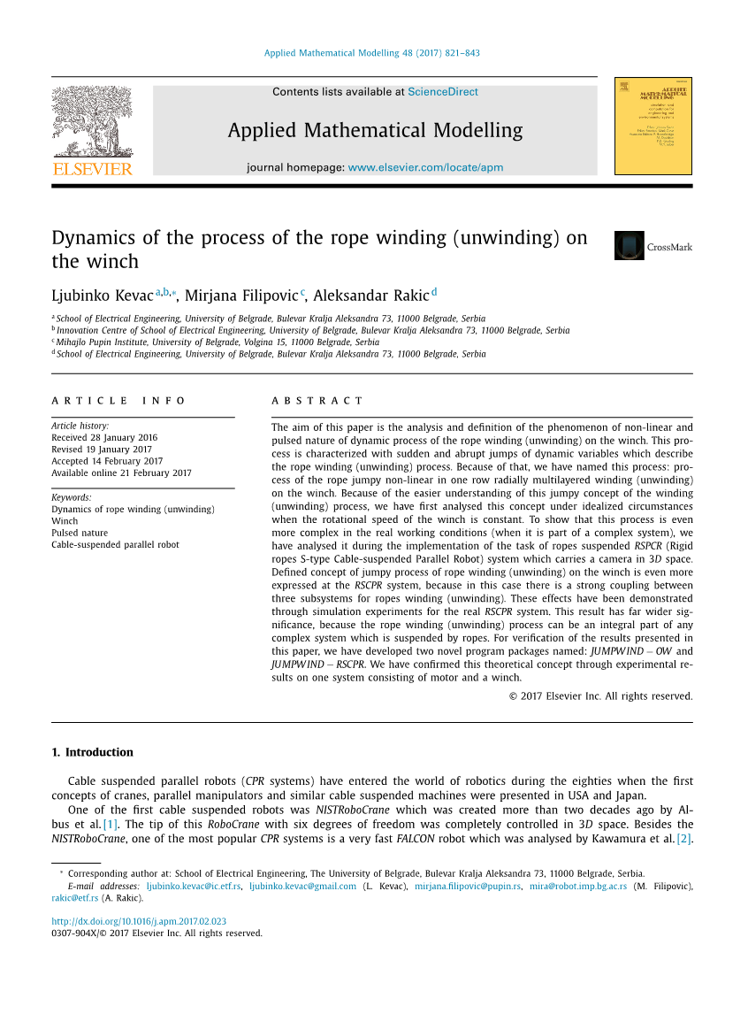 摘要:本文的目的是对卷扬机缠绕(退卷)动态过程的非线性和脉冲性质的现象进行分析和定义。这个过程的特点是突然和描述了绳缠绕(展开)过程的突然跳跃的动态变量。因此,我们把这个过程命名为:在卷扬机上的一排径向多层绕组(解卷)中绳跳跃非线性的过程。由于我们更容易理解这种缠绕(解卷)过程的跳跃性概念,我们首先在理想化的环境下分析了这个概念。当卷扬机的转速恒定时,为了说明在实际工作条件下(当它是复杂系统的一部分)时,这个过程更为复杂,我们在执行绳索悬挂RSPCR(刚性绳索S型悬索并联机器人)系统的任务中分析了它,该系统在3D空间中携带相机。卷扬机卷绕(解卷)在绞盘上的跳跃过程的定义更是在RSCPR系统中表达,因为在这种情况下,三个子系统在绳索缠绕(展开)之间有很强的耦合。这些结果已经通过实际的RSCPR系统的模拟实验证明。这一结果具有更广泛的意义,因为绳索缠绕(展开)过程可以是任何复杂的系统被绳索悬挂的一个组成部分。为了验证本文所给出的结果,我们开发了两种新的程序包:JavpSouth-OW和RojpWiel-RSCPR。我们已经通过一个由电动机和卷扬机组成的系统的实验结果证实了这个理论概念。