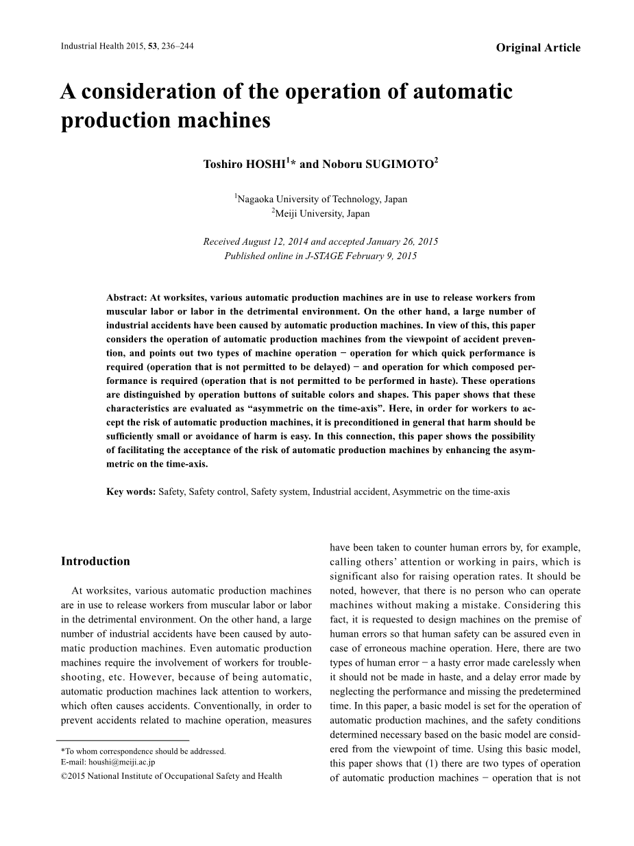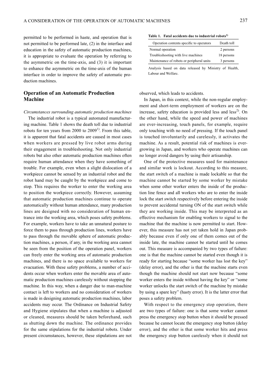 本文表明这些特性被评估为“在时间轴上不对称”。在这里,为了让工人能够承受自动生产机器的风险,一般认为危害应该是足够小或避免伤害是容易的。在这方面,本文显示了这种可能性即通过增强时间轴上的不对称来促进自动生产机器的风险的接受。