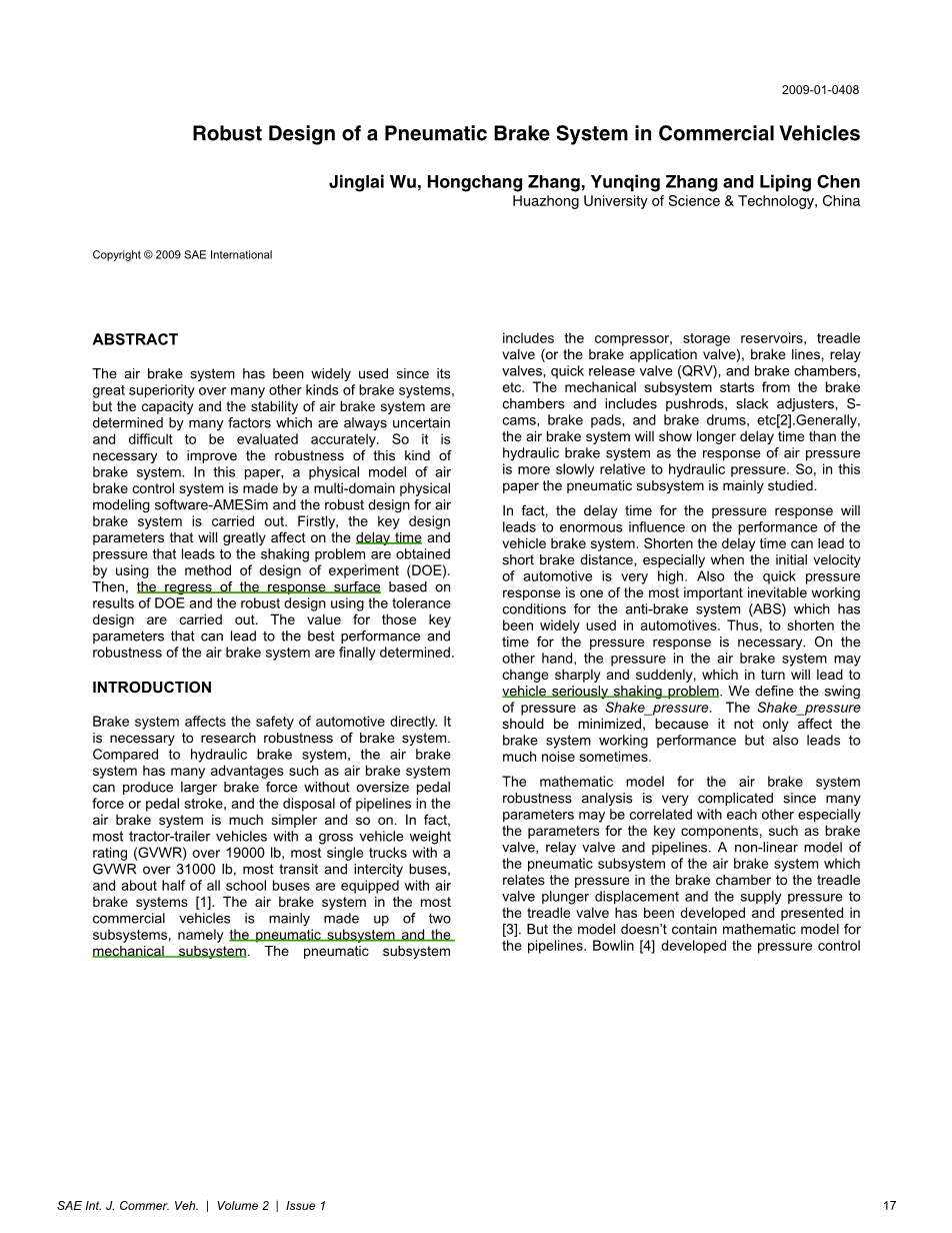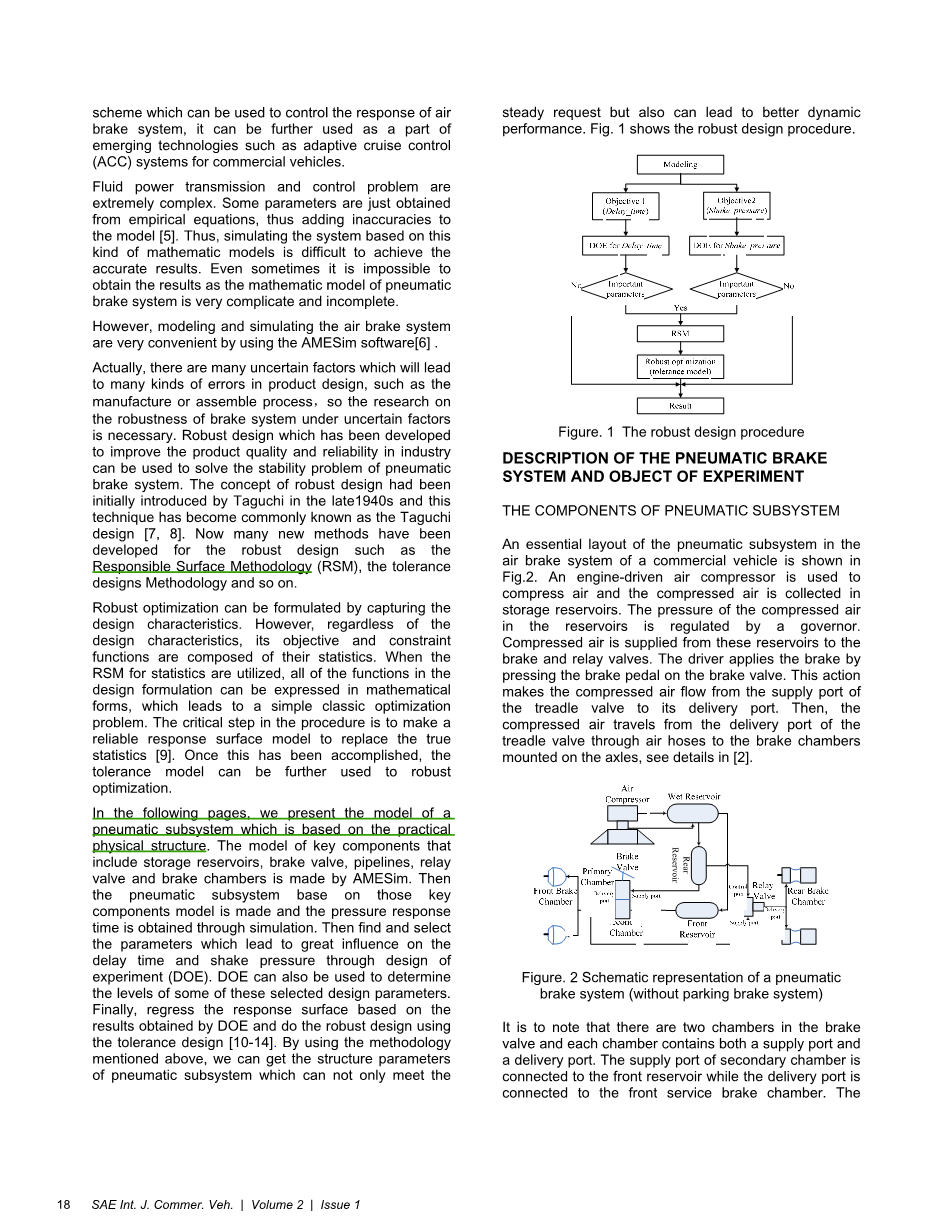 空气制动系统与其他制动系统相比具有很大的优越性,因此已经得到了广泛的应用。但是,空气制动系统的容量和稳定性是由许多因素所决定的,而这些因素往往又是不确定的,难以对其进行准确评估。因此,有必要提高这种制动系统的稳定性。在本文中,一个空气制动控制系统的物理模型是由一个多领域物理建模软件AMESim所绘制并对空气制动系统进行了鲁棒性设计。首先,利用实验设计(DOE)的方法,得到了影响振动时间和压力的关键设计参数。然后,根据实验设计(DOE)的结果进行响应面回归,采用容差设计进行鲁棒设计。从中获取空气制动系统表现优异的那些关键参数的值,决定空气制动系统的最终鲁棒设计。