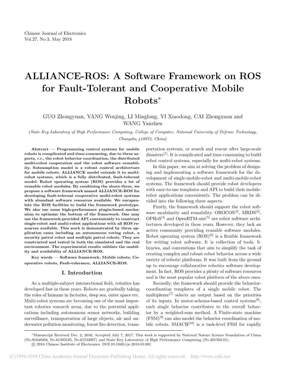 摘要-移动机器人程序控制系统从机器人行为协调、分布式多机器人协作和机器人软件可重用性三个方面进行研究,是一个复杂而耗时的系统。包容模型是一种适用于移动机器人的鲁棒控制结构。联盟模型将其扩展到多机器人系统,这是一个完全分布式的容错模型。机器人操作系统(ROS)提供了大量可重用的机器人模块。结合以上三个方面,提出了一种基于联盟ROS的软件框架,用于开发具有丰富软件资源的容错协同多机器人系统。我们封装了ROS设施来构建框架原型。我们还使用一些基于插件的高性能机制来优化框架的底部。我们可以使用框架提供的API方便地构建具有所有可用ROS资源的单机器人和多机器人应用程序。本文以自主漫游机器人、安全巡逻机器人和多个巡逻机器人为例进行了说明。它们是在模拟环境和真实环境中构建和测试的。实验结果验证了Alliance-ROS的可用性和可用性。