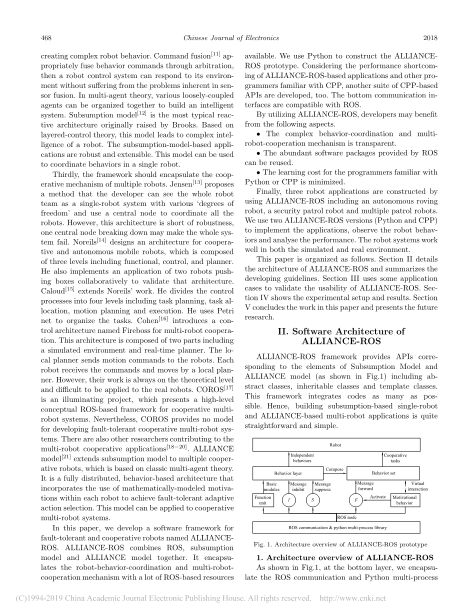 本文的组织结构如下。第二节详细介绍了Alliance-ROS的体系结构,并总结了开发指南。第三节使用一些应用案例来验证Alliance-ROS的可用性。第四节给出了实验装置和结果。第五部分对本文的工作进行了总结,并提出了今后的研究方向。