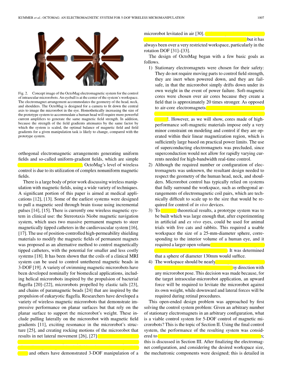 在磁控微机器人的研究中,Bradley J. Nelson的小组受到细菌鞭毛的自然设计的启发,提出了一种人工细菌鞭毛微型机器人[14]使用弱磁场可以以可控的方式游泳。鞭毛微型机器人由一个螺旋尾部和一个小软磁材料组成,一端为头部。鞭毛微型机器人的螺旋推进可以通过电磁线圈精确控制。他们还提出了使用3D激光光刻作为用于靶向细胞递送的运输微机器人的多孔微型激光器[15]. Metin Sitti提出了一种由磁力矩驱动的微型机器人。它可以通过两对亥姆霍兹线圈和一对带有粘滑运动的夹紧线圈来控制[16]. 水平运动由亥姆霍兹线圈控制,夹紧线圈产生粘滑运动的驱动信号。苏霍公园提出了一种由磁力控制的微机器人。驱动系统由两对亥姆霍兹线圈和两对麦克斯韦线圈组成[17]. 磁力由麦克斯韦线圈提供,亥姆霍兹线圈用于产生微机器人旋转的扭矩。然而,在操纵微型机器人探索人体时,仍有许多工作需要完成。