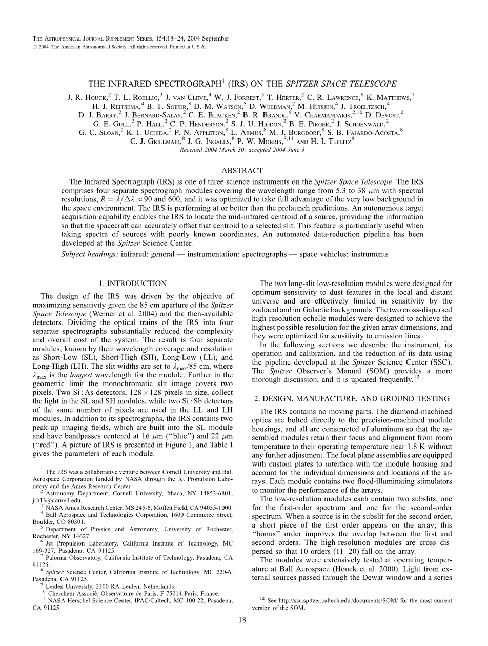 红外摄谱仪(IRS)是斯皮革太空望远镜上的三种科学仪器之一。IRS由我们单独的光谱仪模块组成,其波长范围从5.3-38微米,具有光谱分辨率,R=A90和600,并对其进行了优化,以充分利用空间环境中非常低的背景。美国国税局的表现达到或超过了发射前的预测。自主目标的捕获能力是IRS能够定位来源的中红外质心,提供信息,使航天器能够准确地将质心偏移到选定的狭缝。这个特性在获取坐标未知的光谱时特别有用。斯皮策科学中心已经开发了一个自动化的数据压缩管道。