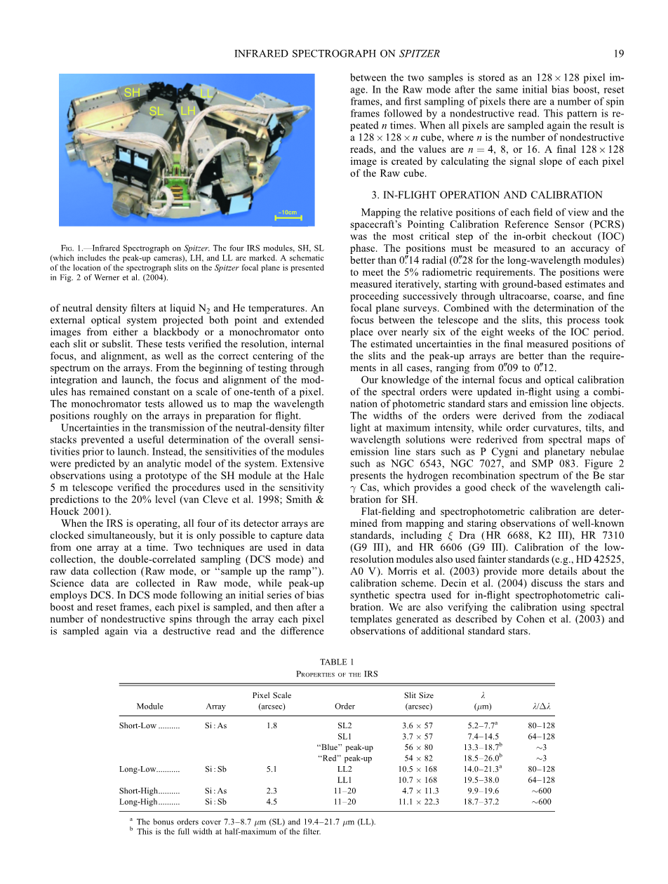 平场和分光光度校准是根据已知标准包括E-Dra(HR6688,K2)、HR 7310(G9III)和HR 6606(G9)的绘图和凝视观察确定的。低分辨率模块的校准也使用较暗的标准(例如HD 42525,A0 V)。Morris等人(2003年)提供了有关校准方案。Decin等人(2004年)讨论了用于飞行中分光光度校准的恒星和合成光谱。我们还使用Cohen等人(2003年)所述的光谱模块和其他标准恒星的观测来验证校准。