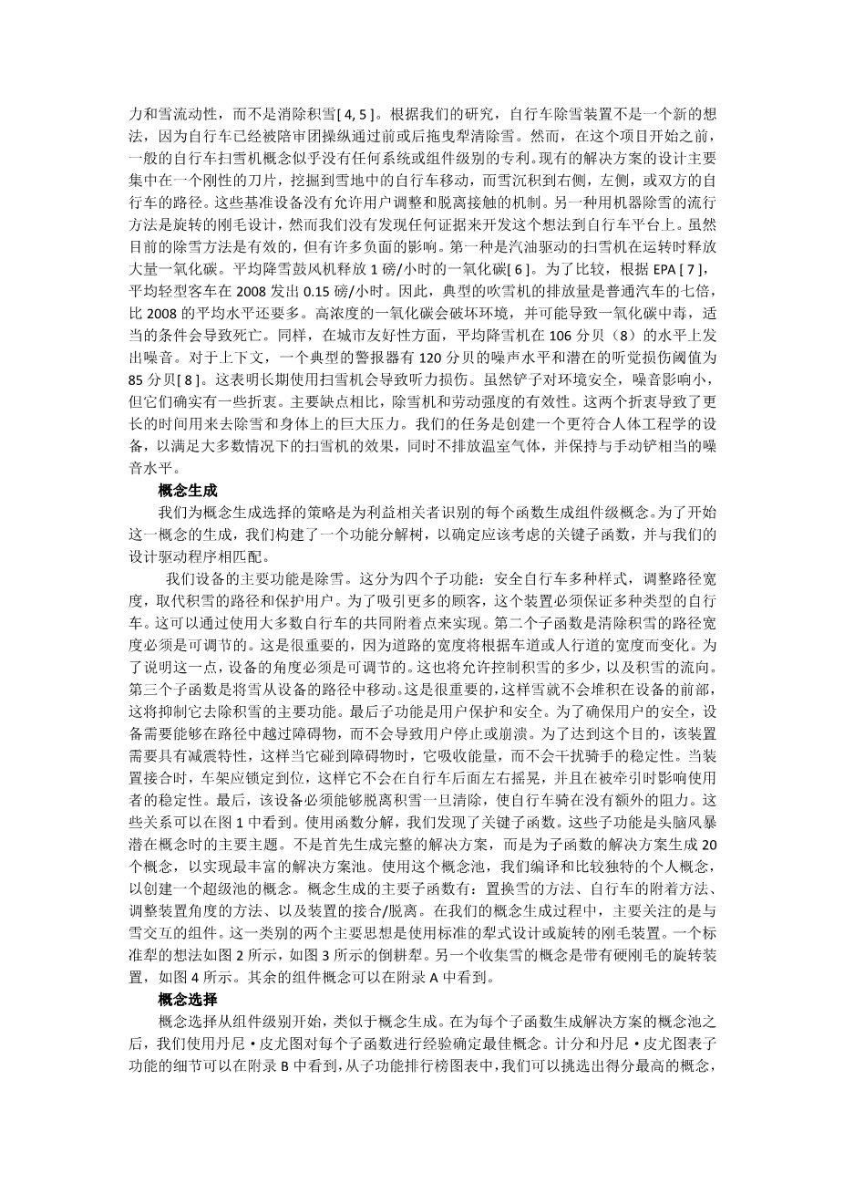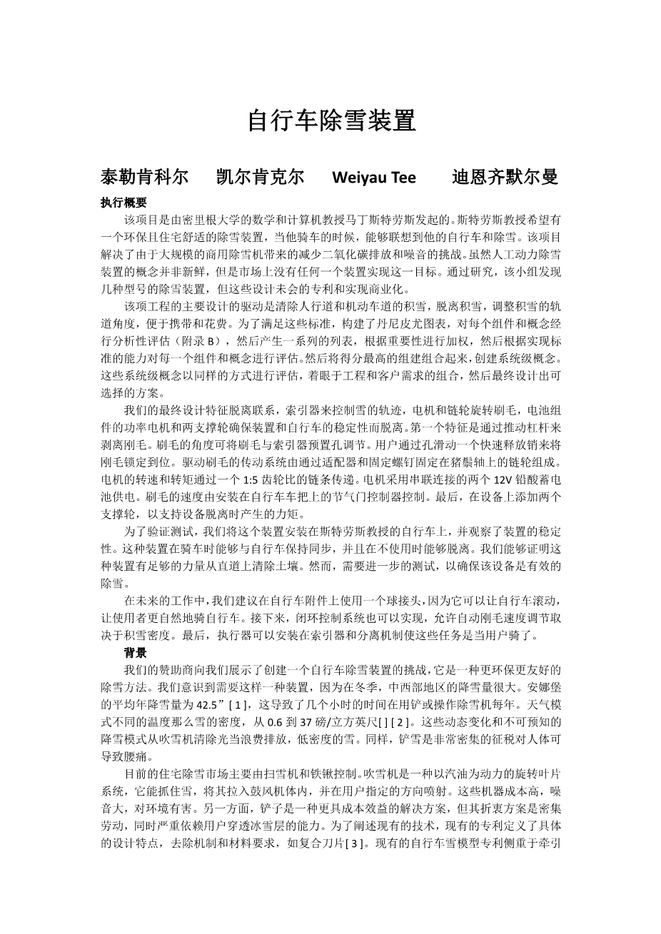 This project was motivated by Professor Martin Strauss, a University of Michigan Math and Computer Science professor. Professor Strauss desired an environmental and residential friendly snow removal device that can be easily attached to his bicycle and clear snow as he rides. The project addresses the challenge of reducing carbon emissions and noise produced by large scale commercial snow blowers. While the concept of a human powered snow removal device is not new, there are no devices available on the market that achieve this goal. Through research, the team found several models of human powered snow removal devices but none of these designs have been patented or commercialized.