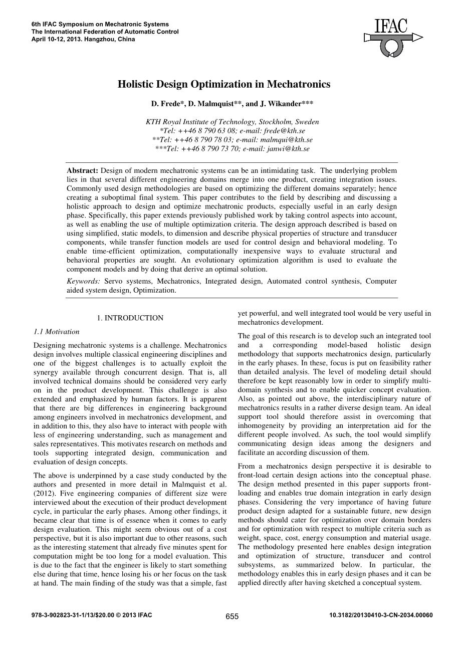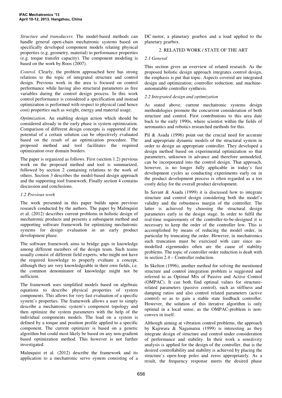 1.2以前的工作:本文提出的工作建立在以前进行研究的作者上。利用Malmquist等人的论文。(2012)描述了机电一体化产品整体设计中存在的问题,并给出了在早期产品开发阶段优化设计评估的机电一体化系统的后续方法和支持软件框架。