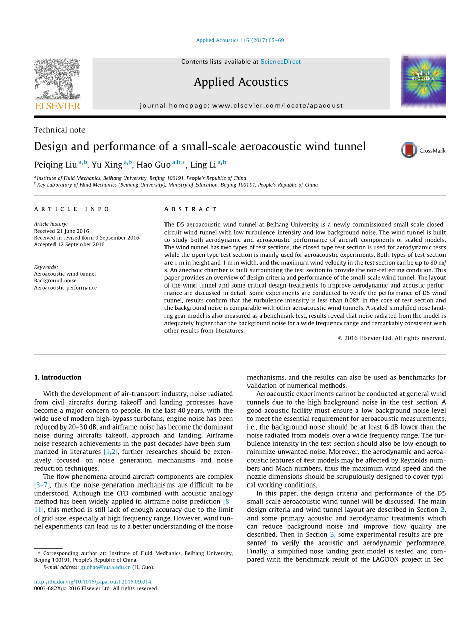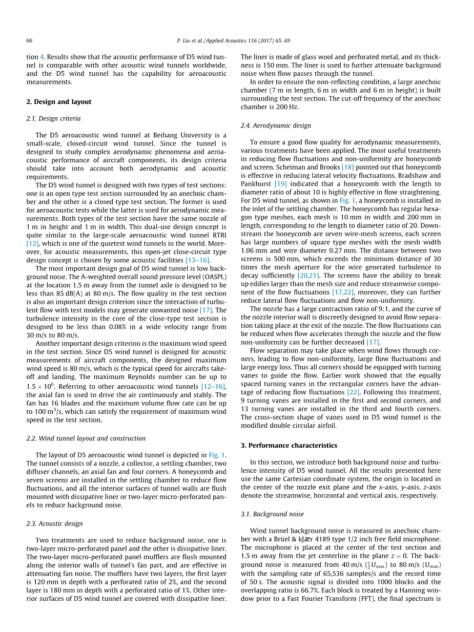 北航建造了一座小型气动声学风洞。本文阐述了风洞的设计准则和总体布局。其具有一个正方形的尺寸1m*1m的测试段。双层微孔结构面板和消声衬垫铺设在风洞内表面用来减弱背景噪声。同时,安置在稳定段的蜂窝器和数张阻尼网用来提升流动品质。风洞的气动声学性能和空气动力性能都被检测和证实。结果显示其背景噪声能和世界上其他的气动声学风洞相媲美。其测试段核心区域湍流强度低于0.08%。声学性能和空气动力性能都达到设计目标。最后测试了一个简单的起落架噪声模型作为基准。结果显示起落架的噪声辐射强度比背景噪声高至少6分贝,满足了对气动声学的测量要求。