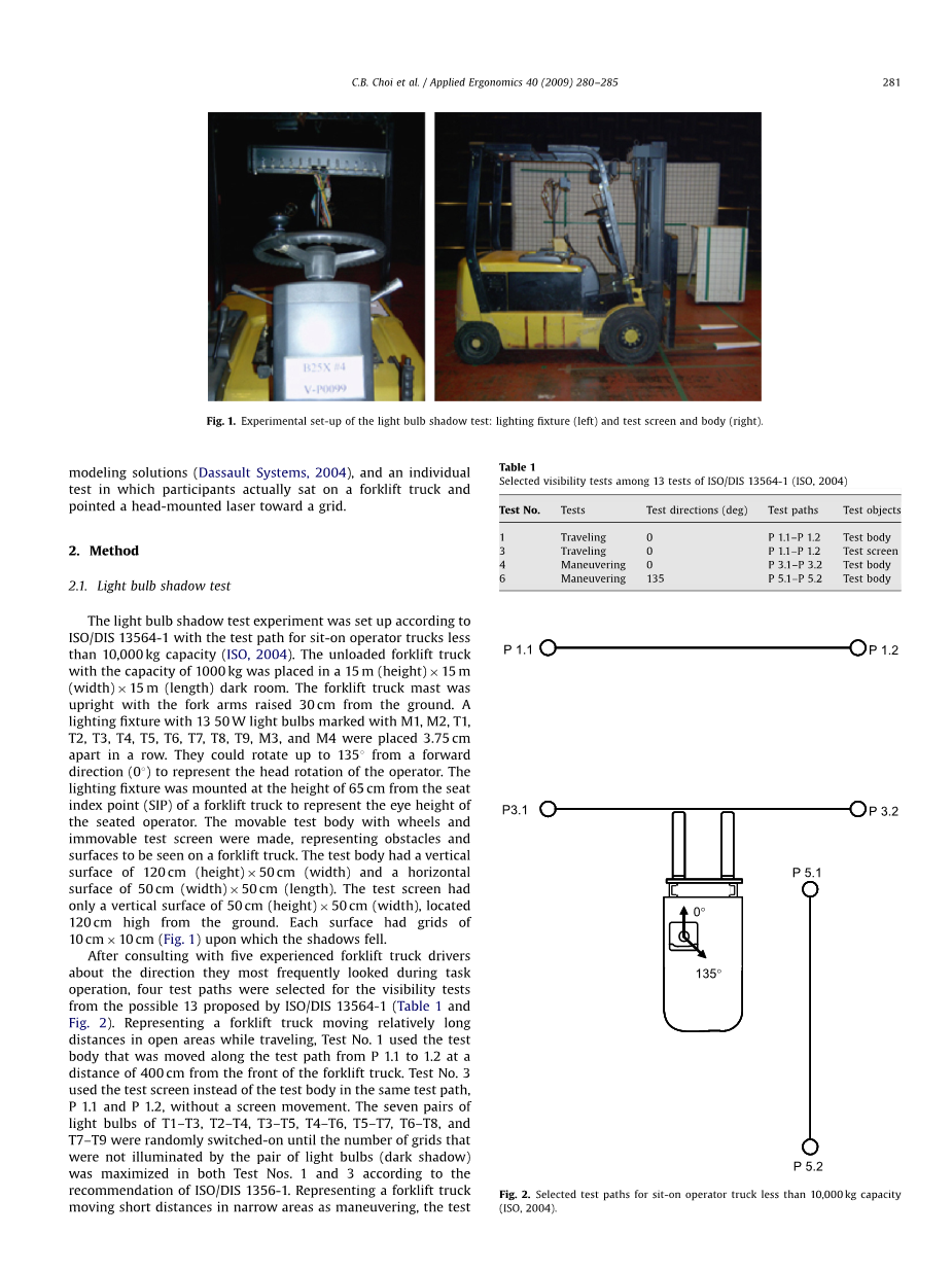 使用CATIA V5R13人体模型解决方案开发人体模型(Dassault Systems,2004)基于第五百分位德国男性身材的年龄在26至40岁之间的人体测量数据集的数字人体模型。由于第五百分位数的德国男性身材数据与第五十位韩国男性叉车卡车活跃驾驶员人群相似,因此该人群被雇用,因为该人群的人体测量数据在软件中不可用(2006年,Pheasant和Haslegrave)。人体模型的姿势是基于坐在叉车上的9名韩国男性直接测量的平均关节角度。如图所示图3叉车也是用CAD开发的。人体模型视力评估测试使用与双目视觉灯泡阴影测试相同的方法。进行两次机动测试,测试主体和测试屏沿着从P1.1到P1.2的测试路径进行,测试屏沿测试路径从P3.1到P3.2以及从P5.1到P 5.2,与灯泡阴影测试中的开灯灯泡具有相同的眼对