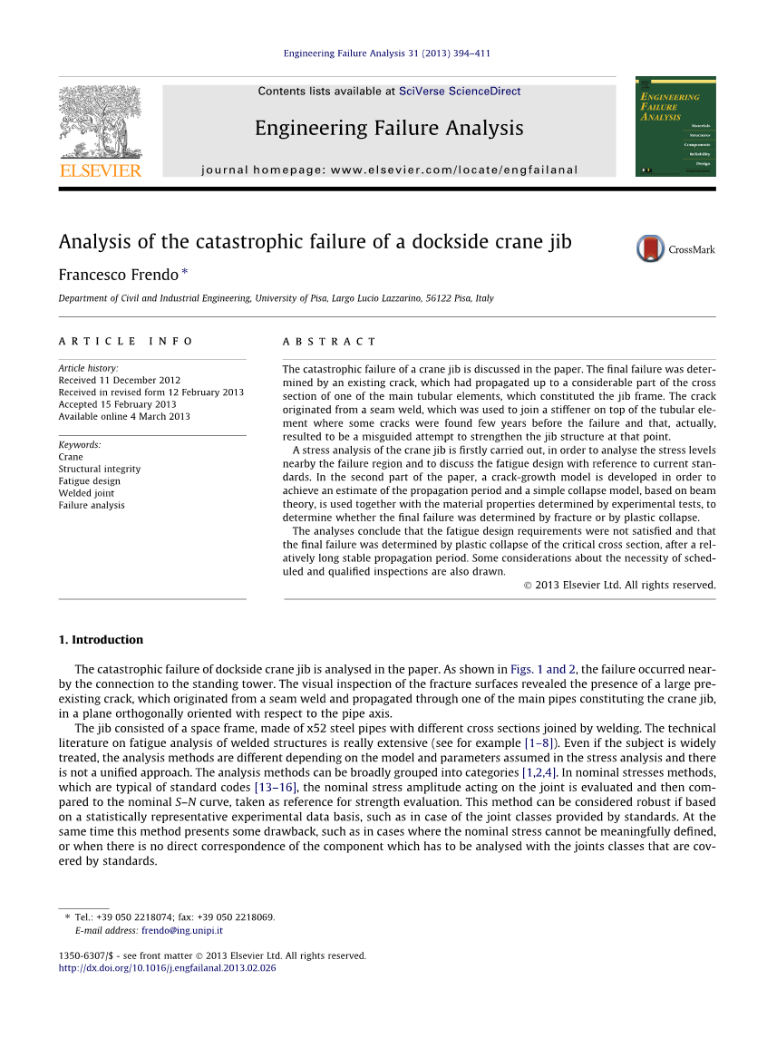 本文讨论起重机吊臂的灾难性故障。最后的失败是由现有的裂缝决定的,裂缝已扩展到构成臂架的一个主管件的横截面的相当大的一部分。裂缝起源于缝焊,用于在管状元件顶部连接一个加强筋,在加强筋失效前几年发现一些裂纹,实际上,这导致了在该点加强臂架结构的错误尝试。