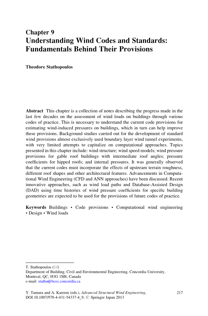 本章收集了一系列注释,介绍了近几十年来通过各种实践规范评估建筑物的风荷载所取得的进展,这对了解当前的用于估算建筑物上的风压的代码规定是很有必要的,这反过来又可以帮助改进这些规定。开展背景研究是为了开发标准的风力规程,几乎专门用于边界层的风洞实验,对于利用计算方法的尝试非常有限。本章介绍的主题包括:风向结构; 风速模型; 具有中间屋顶角的人字形屋顶建筑物的风压规定; 四坡屋顶的压力系数; 和内部压力。一般认为,现行规范必须包含上游地形粗糙度,不同屋顶形状和其他建筑特征的影响。已经讨论了计算风力工程的进展(CFD和ANN方法),最近的创新方法,如风荷载路径和使用特定建筑物几何形状的风压系数时间历史的数据库辅助设计(DAD),预计将用于未来实践规范的规定。