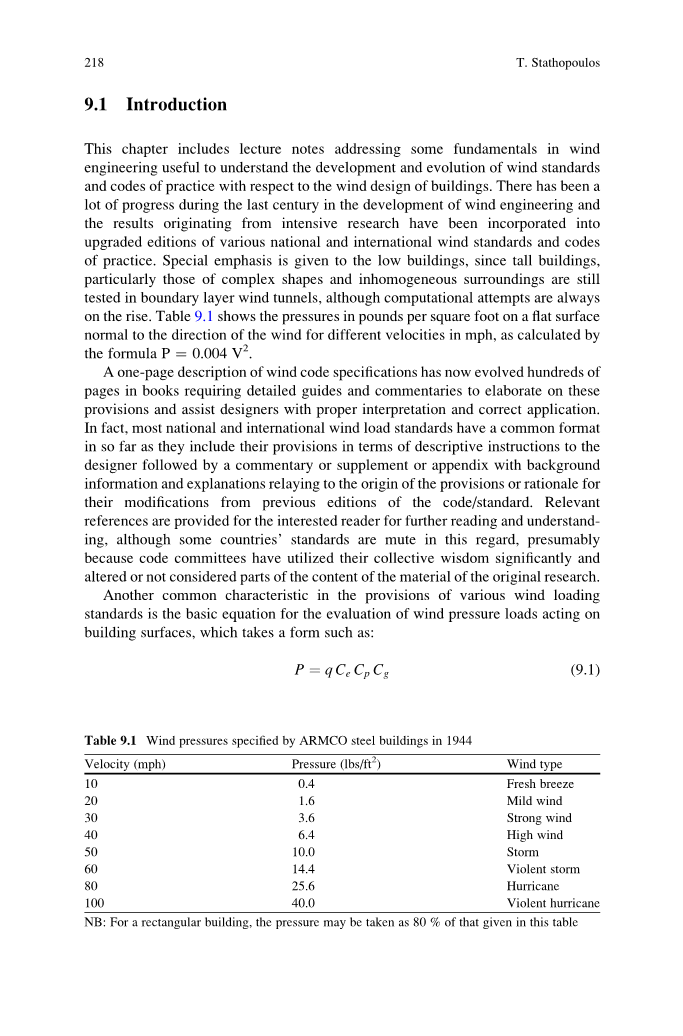 本章包括讲授风力工程基础知识的讲义,有助于理解风力标准和建筑风力设计规范的发展和演变。上个世纪风力工程的发展取得了很大进展,源于深入研究的成果已被纳入各种国家和国际风力标准和规范的升级版本。特别强调低层建筑,因为高层建筑,特别是那些复杂形状和不均匀环境的高层建筑仍然在边界层风洞中进行测试,尽管计算尝试总是在增加。表9.1列出了不同速度(单位为英里/小时)下垂直于风向的表面上的每平方英尺磅数的压力,由公式P = 0.004Vsup2;计算。