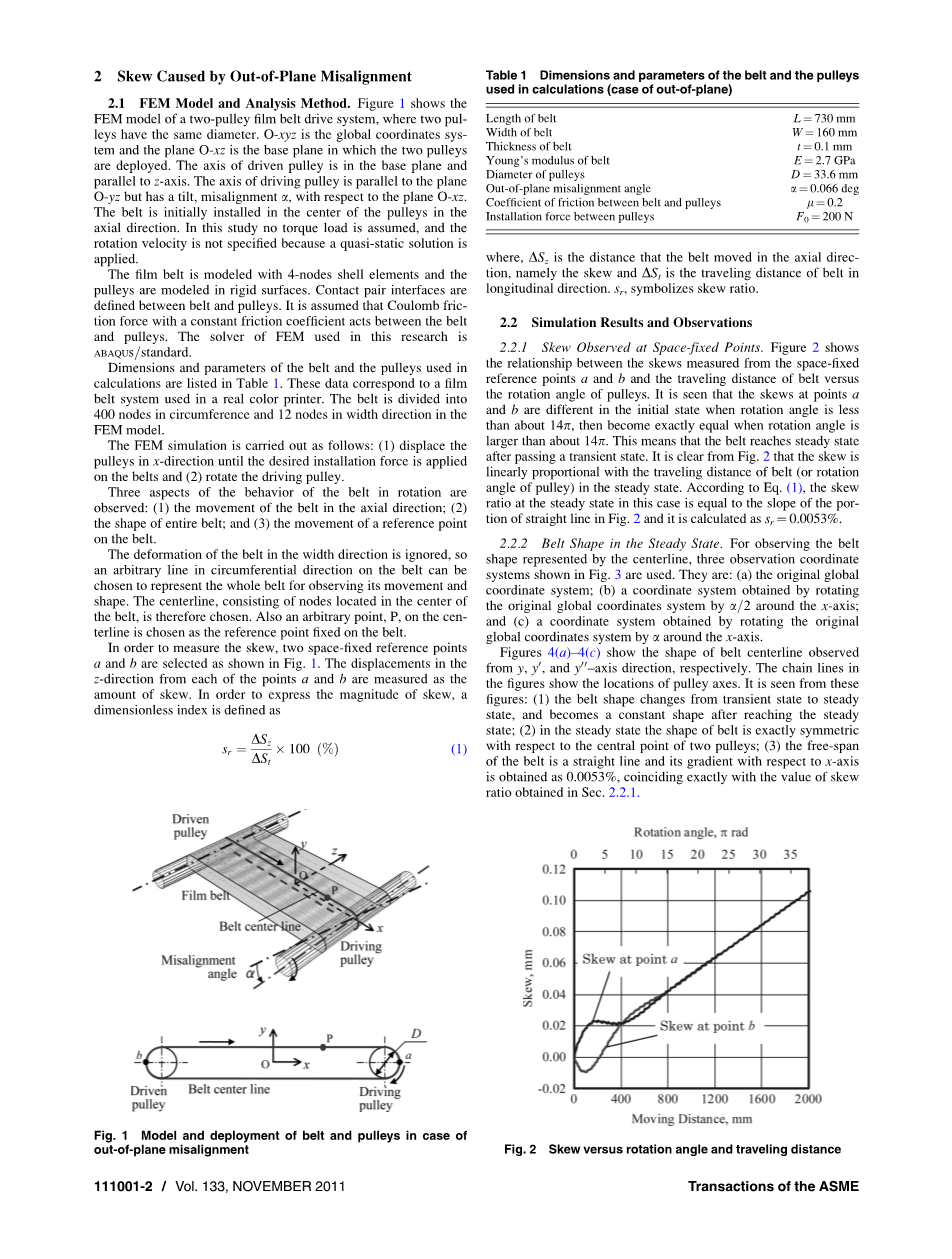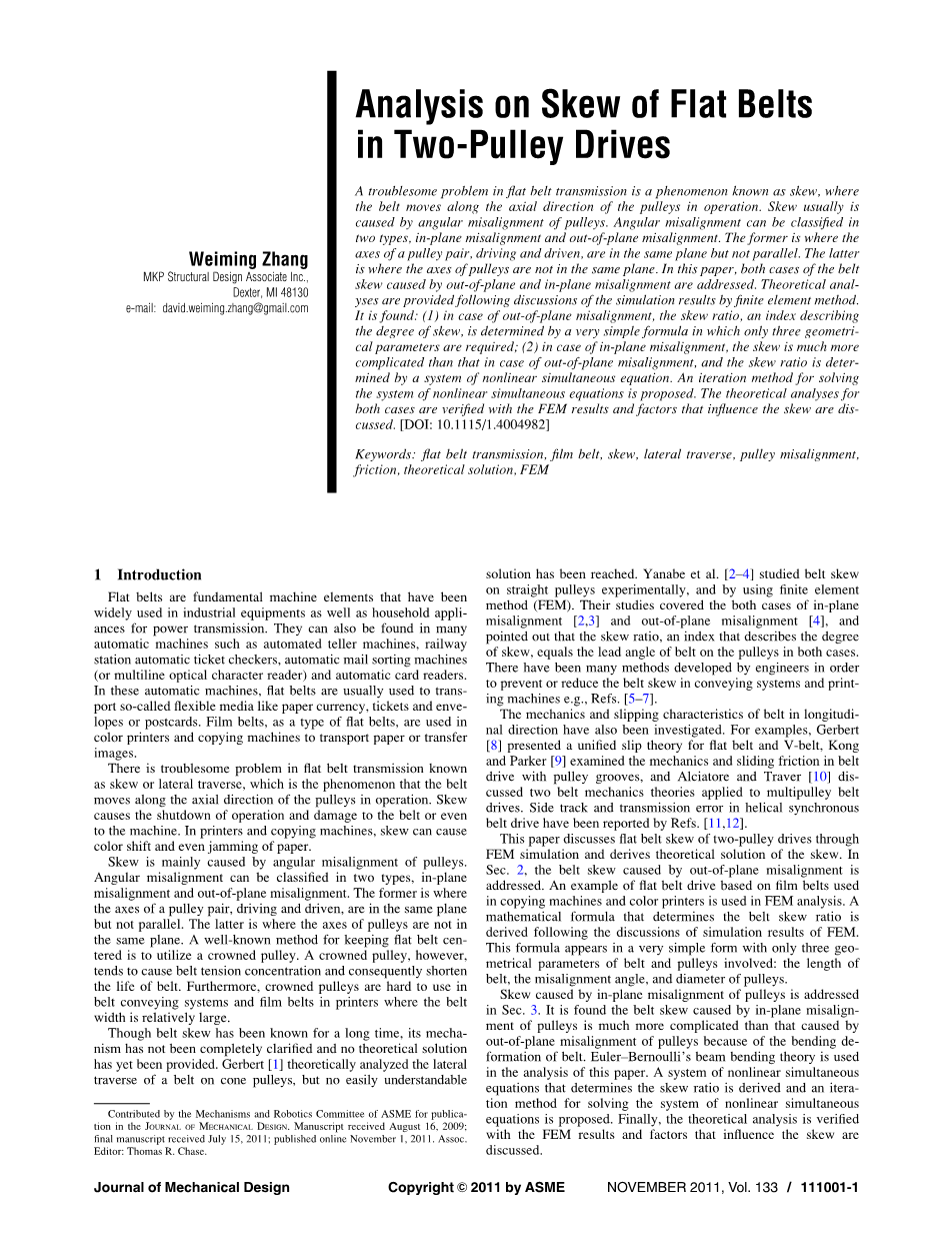 平带传送中一般会出现偏斜现象,即带在运行中沿着滑轮轴向移动。偏斜现象通常是由滑轮安装角度偏差造成的。通常角度偏差可分为两种类型,平面内偏差和平面外偏差。前者驱动轮和被驱动轮的轴线处于同一平面内但不平行,后者两轴线不在同一平面内。在本文中,主要解决由平面外和平面内错位引起的皮带偏斜问题。通过有限元方法模拟提供的理论分析发现:(1)在面外失准的情况下,偏斜率(一个描述偏斜程度的指数)可由一个非常简单的公式确定,其中只需要三个几何参数;(2)在面内失准情况下,偏斜比面外失准情况复杂得多,偏斜率由非线性联立方程组确定,求解非线性联立方程组用迭代方法。两种情况都用有限元分析影响偏斜的因素和结果。