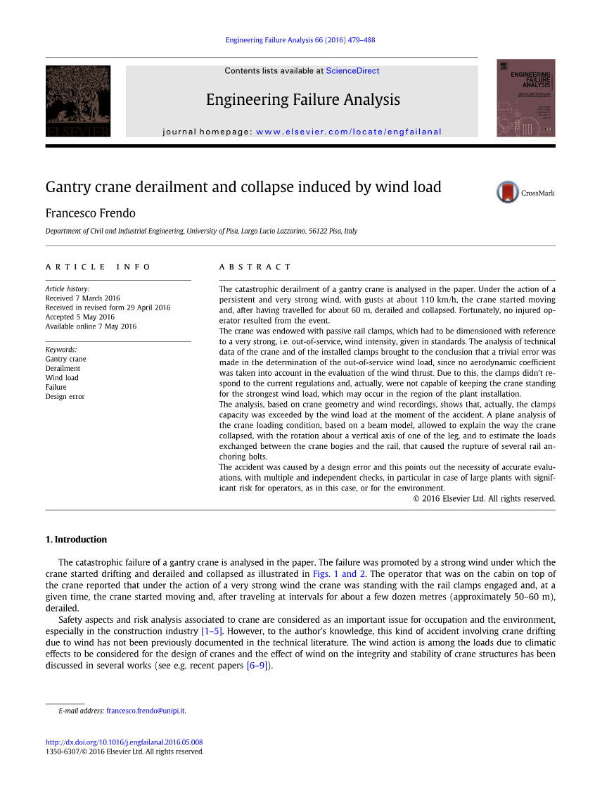 根据起重机几何形状和风力记录的分析表明,事故发生时的风力载荷超出了夹具的承载能力。基于梁模型的起重机满载状态,以绕着一个腿的竖直轴线旋转做平面分析解释了起重机倒塌的方式,并且对在起重机转向架和轨道之间相互的载荷做了估计,这种载荷导致几个轨道锚固螺栓的破裂。