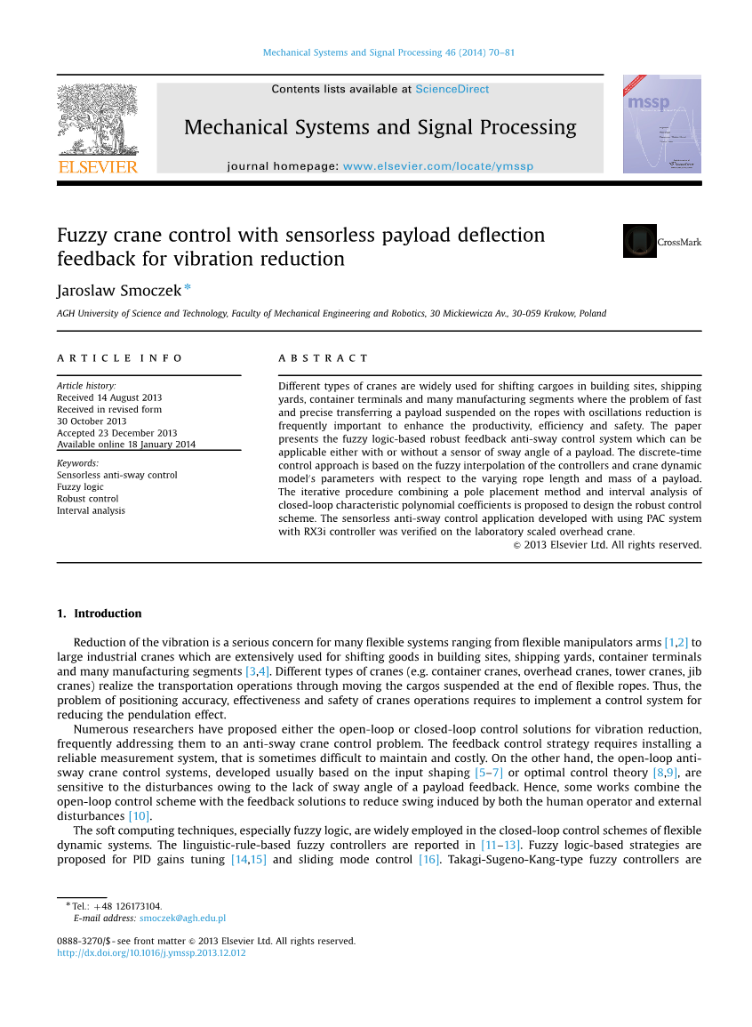 文献中描述的大多数基于模糊逻辑的起重机抗摇摆控制问题方法都是基于语言规则的策略,所提出的模糊控制器设计技术大多仅适用于涉及训练数据示例的固定数量的规则来调整隶属函数参数。 起重机控制系统的稳定性也经常仅仅考虑绳长变化而进行分析。 此外,大多数控制策略通过数学模型或机电实验室模型进行验证。 因此,对于那些正在寻找可以在工业实践中实施的起重机控制系统的测量设备,高效控制规律,软硬件解决方案的研究人员来说仍然有一席之地。