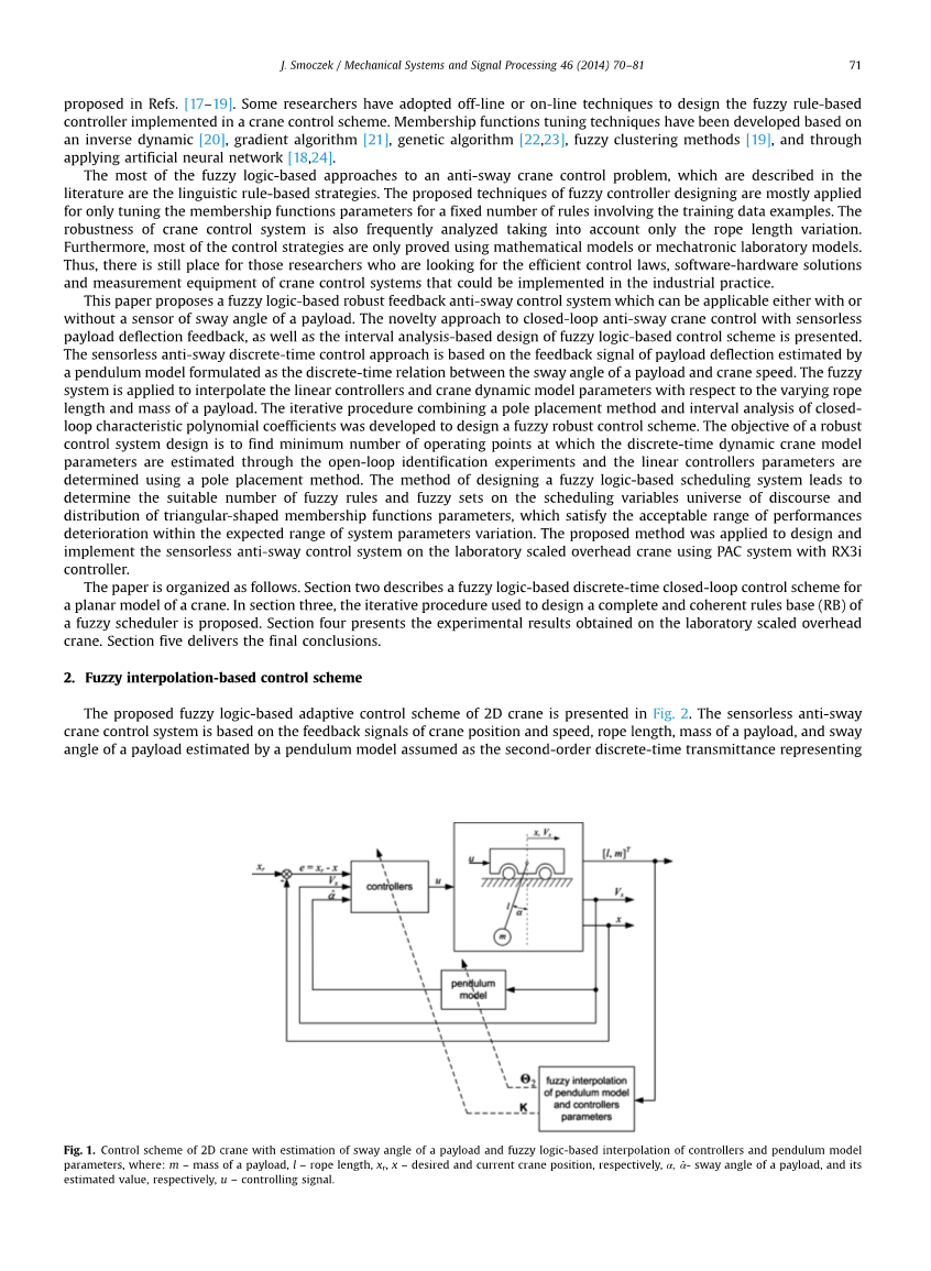 软计算技术,特别是模糊逻辑,被广泛应用于柔性动力系统的闭环控制方案。 基于语言规则的模糊控制器被报道在[11–13]。 基于模糊逻辑的策略被提出用于PID增益调整[14,15] 和滑动模式控制[16]。 Takagi-Sugeno-Kang型模糊控制器在参考文献中提出[17–19]。 一些研究人员采用离线或在线技术来设计基于模糊规则的控制器用于起重机控制方案。 基于逆动态已经开发了成员函数调整技术[20],梯度算法[21],遗传算法[22,23],模糊聚类方法[19],及应用人工神经网络[18,24]。