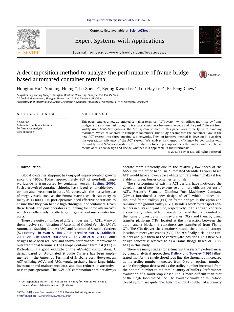 最近,Zhen,Lee,Chew,Chang和Xu(2012)也研究了这个FB-ACT系统,并将其与AGV-ACT系统进行比较。 然而,他们认为有足够数量的QC和YC。所以FTs,GTs和AGVs不需要在QCs和YCs上等待。 此外,他们的研究没有考虑加载/卸载TP的速度。 在这项研究中,我们考虑了限制QCs和YCs的数量以及Tp的处理速率。 此外,这项研究通过组合不同类型的处理机械有助于估计所能实现的吞吐量。