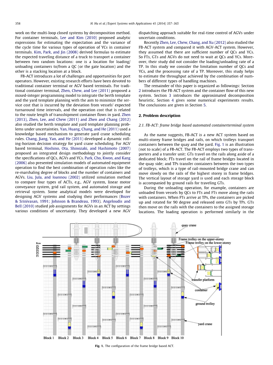 现有的ACT设计的缺点促使了开发新的,更便宜和更高效的ACT的趋势。 最近上海振华港机公(ZPMC)引入了一个新的ACT设计,这个设计利用安装于铁轨上的框架小车(FTs)和地面轨道小车(GTs)在码头和堆场之间运输集装箱。 在这个设计中,集装箱通过使用码头起重机(QCs)首先从船上卸到其中一个被安装于框架桥FTs,然后通过使用位于有相互联系的挡板和一个模块之间的转移平台(TP),集装箱从FTs转移到GTs。 GTs传送位于存储区附近的集装箱到场(YCs)下。 YCs最后抓取集装箱并把它们放到正确的堆场位置。 在这个研究中这个新的ACT设计概念被称为基于框架桥的ACT(FBACT)。
