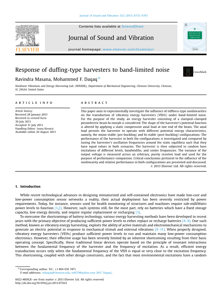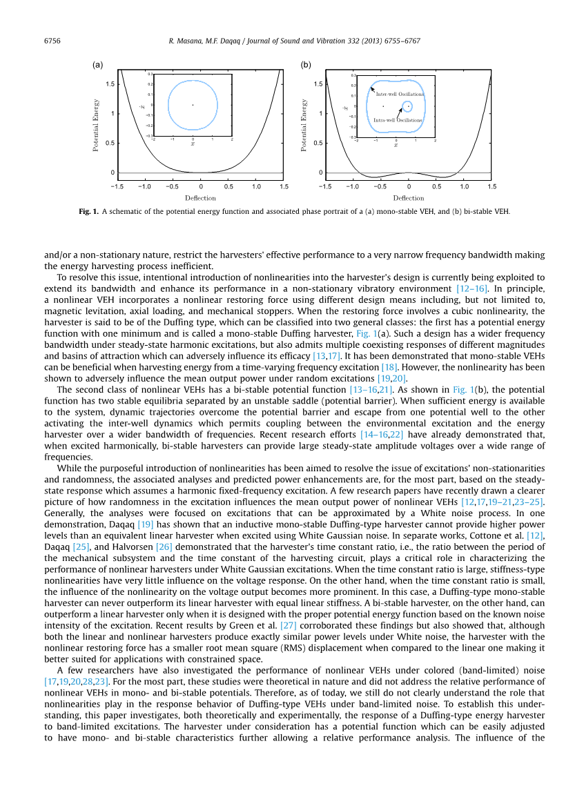 一些研究人员还研究了非线性VEHs在有色(带限)噪声下的性能。就绝大多数而言,这些研究毕竟是理论上的,并没有解决非线性收集器在单稳态和双稳态电势下的相对性能。因此,直到今天,我们仍然不清楚,非线性对Duffing型VEHs在带限噪声下的响应特性所起的作用。为了建立这一认识,本文从理论和实验上研究了Duffing能量收集器对带限激励的响应。研究中所采用的收集器有一个潜在的功能,即可以很容易地调整为具有单稳态和双稳态特征,进一步允许相对性能分析。本文给出了激励的中心频率、带宽和输出电压均方值的影响。