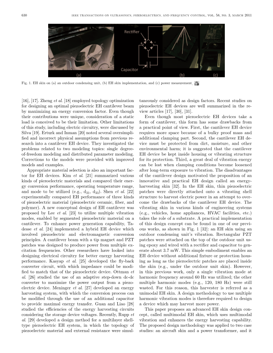 适当的材料的选择也是能量采集器的一个重要因素。基姆等人[21]总结了各种压电材料并且比较了它们的能量转换性能、工作温度范围和使用模式。沈等人[ 22 ]实验比较了三种压电材料(压电陶瓷、光纤和聚合物)的能量采集性能。李等人[23]提出了一种新的能量采集悬臂梁的概念设计,利用在悬臂上分配分段的压电材料来利用多个振动模式。为了提高发电能力,塔德塞[24]实现了一种集压电和电磁转换原理于一体的混合式能量采集器。一个附有小块磁铁和锆钛酸铅的悬臂梁被设计了出来,它能从多个激励频率产生能量。其他研究人员已经在研究设计电路以获得更好的能量采集性能。kasyap等人[25]开发了飞回转换器电路,其阻抗可以被修改,以匹配压电器件。奥特曼等人[26]研究了使用自适应降压dc变换器以最大限度地提升压电设备的输出功率。Meninger等人[27]开发了一种能量收集系统,通过使用附加电容器来改变转换过程以提供最大能量转换效率。管和廖[28]研究了考虑储能器件电压的能量采集电路的效率。最近,拉普等人[29]开发了一种多层压电型能量采集系统的设计方法,其中压电材料和外部电阻的拓扑结构被作为设计因素同时考虑。评论文章[17][30][31]很好的总结了最近压电能量采集器的研究。尽管大多数压电能量采集器都采用悬臂形式,但从实际的情况来看,这种形式有一些缺点。首先,悬臂式能量采集装置需要更大的空间,因为它有庞大的质量和额外的夹紧部分。其次,悬臂式能量采集装置必须防止灰尘、湿气和其他环境伤害,建议将悬臂能量采集装置安装在外壳或振动结构中以保护它。第三,长时间振动后,夹紧状态松动时,会产生大量的振动能量。悬臂梁设计的缺点促使的命题的创新性和实用性的设计称为子皮[32]。在能量采集表皮,薄压电片直接连接到一个振动的外壳结构来获得电力,以克服悬臂能量采集装置的缺点。在各种工程系统(如车辆、家用电器、暖通空调设施等)中,振动表皮起到基底的作用。这一设计理念的实际实现可以在我们以前的工作中找到,如图1 [32]所示:室外冷凝单元的振动的能量采集皮肤。使用环氧树脂在室外单元顶部安装矩形锆钛酸铅压电片,并与整流器和电容器连接,以产生约3.7毫瓦电量。这种简单的方法使得只要压电贴片放置在表皮内侧(例如,在室外单元皮肤之下),就不需要额外的具或保护外壳。然而,在以前的工作中,只有一个单一振动模夹式在60