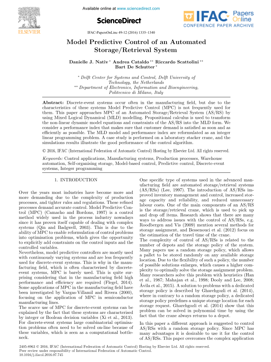 关键字:控制应用,制造系统,生产过程,自动化仓库,自组织化存储,基于模型的控制,预测控制,离散事件系统,整数编程。