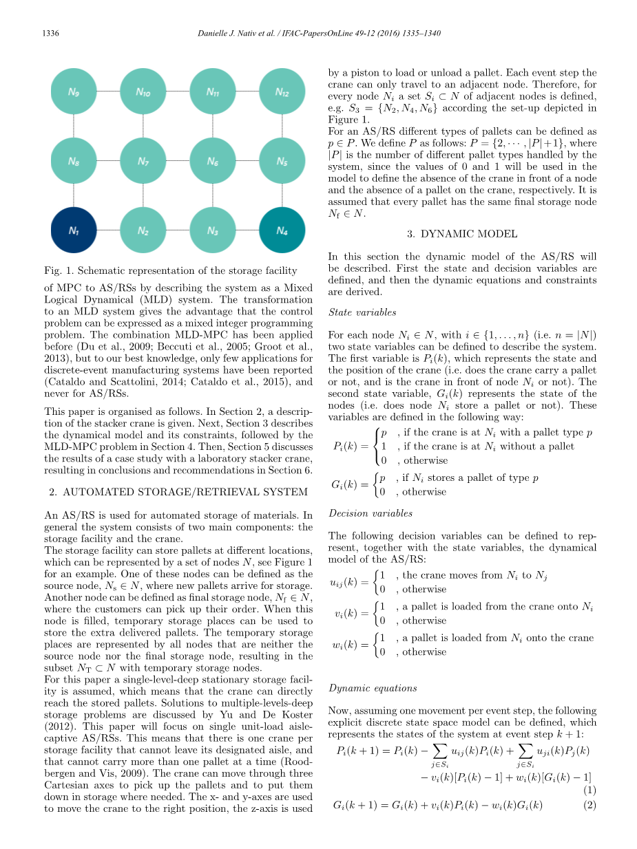 本文提出了一种通过随机存储策略来控制立体仓库的不同的方法。由于MPC具有许多优点,因此希望将其用于控制立体仓库。本文通过将系统描述为混合逻辑动力学(MLD)系统,克服了MPC在立体仓库中的复杂应用。向混合逻辑动力学(MLD)系统的转换带来的好处是,控制问题可以表示为混合整数规划问题。(Du 等, 2009; Beccuti 等, 2005; Groot 等, 2013)之前已经应用了MLD和MPC的组合,但据我们所知,只有少数应用于离散事件制造系统有被提及(Cataldo 和 Scattolini, 2014; Cataldo 等, 2015),但是还从未用于立体仓库。