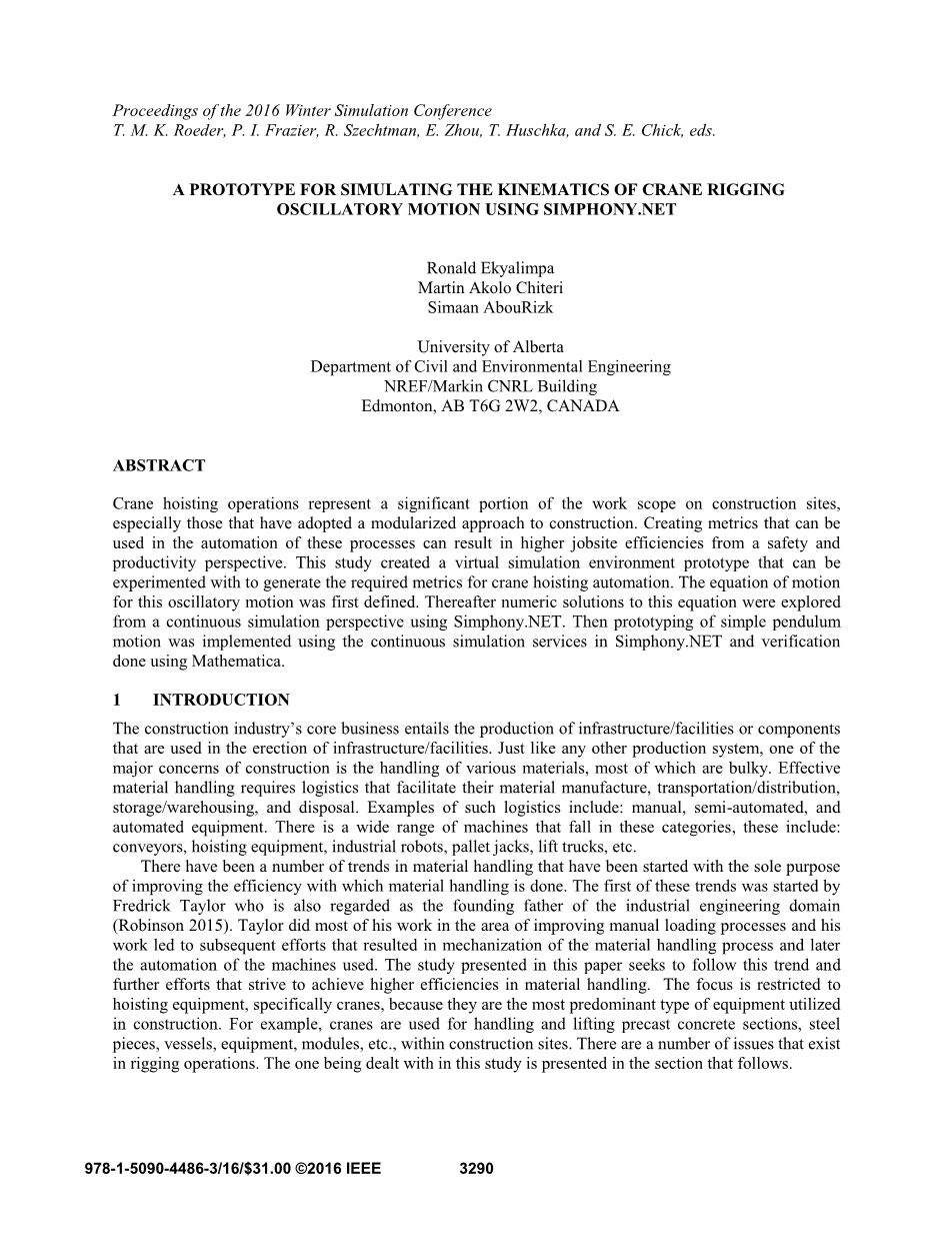 起重机起重作业是施工现场工作范围的重要组成部分,尤其是那些采用模块化方法进行施工的工程。创建可用于这些流程自动化的指标可以从安全性和生产率角度提高现场效率。这项研究创建了一个虚拟仿真环境原型,可以尝试用它来生成起重机吊装自动化所需的指标。首先定义了这种振荡运动的运动方程。此后,使用Simphony.NET从连续仿真角度探索这个方程的数值解,然后使用Simphony.NET中的连续模拟服务和使用Mathematica进行验证来实现简单摆动运动的原型设计。