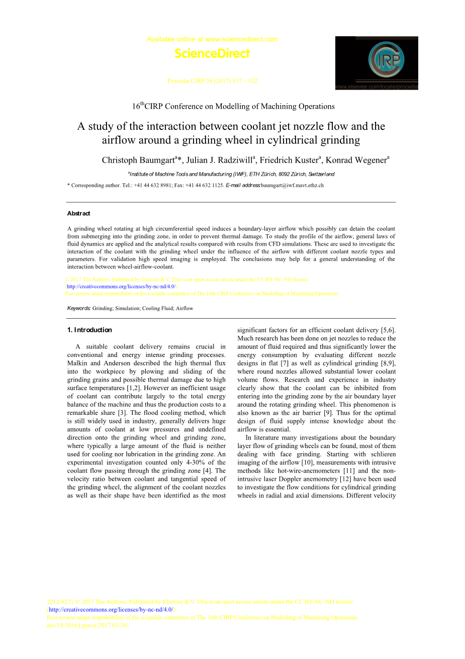 砂轮的圆周速度在高诱导边界层气流,可能为了防止热损伤会把冷却液从投入到磨削区旋转。为了研究气流的轮廓,应用了流体力学的一般规律,并将计算结果与CFD模拟结果进行了比较。用不同的冷却喷嘴类型和参数,研究了在不同气流冷却方式下冷却液与砂轮的相互作用。为了验证该结果,采用高速成像。这些结论有助于全面了解车轮气流冷却液之间的相互作用。