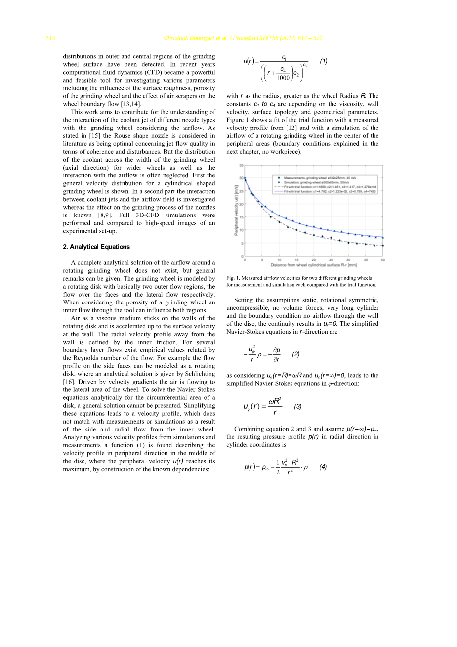 r为半径,大于轮半径r,常数C1与C4取决于粘度、壁面速度、表面拓扑和几何参数。图1显示了一个合适的试验函数,它的测量速度轮廓来自于对周围区域中心的旋转砂轮气流的模拟(下一章解释的边界条件,没有工件)。