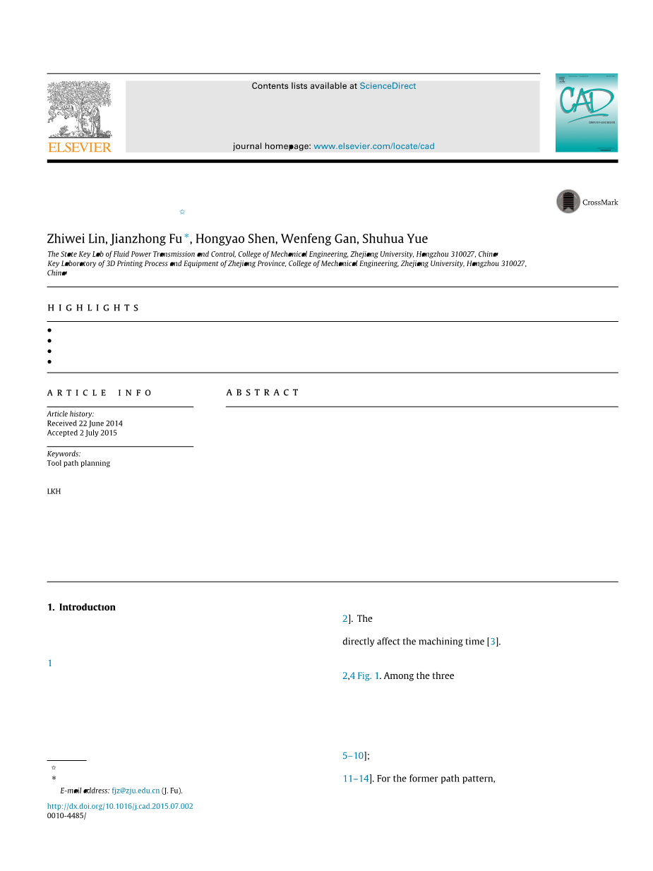 与方向并行或轮廓平行路径拓扑相比,SFC路径拓扑是非主流的。 然而在过去的二十年里,它引起了一些研究的关注,可能是因为它具有只有一条路径均匀分布在表面上的能力,从而导致更少的刀具退回。 Cox等人首次将SFC方法引入到刀具路径规划领域。 [25]和格里菲斯[26]作为理论上的尝试。 它后来被Anotaipaiboon和Makhanov使用并进一步发展[17,27]自适应空间填充曲线和曲线空间填充曲线的概念。 李[28]进一步扩大了Anotaipaiboon和Makhanov的工作,但不规则边界的情况没有得到考虑。 通常,需要三个步骤来生成SCF工具路径:网格生成,路径生成和路径校正。 在我们以前的研究[29提出了一种改进的空间填充曲线(ISFC)方法,并将其应用于T样条曲面工具路径规划。 在这种方法中,表面上的孔自动处理在T样条曲面的前像中,传统SFC中的路径方向变化问题已经用Hermite补偿曲线。 然而,该方法的内在性质是网格生成过程中网格的列(或行)数量要求均匀。 如果这个数字是奇数,那么插入一个额外的列(或行)的网格。 这样的操作无疑会增加总的刀具路径长度。