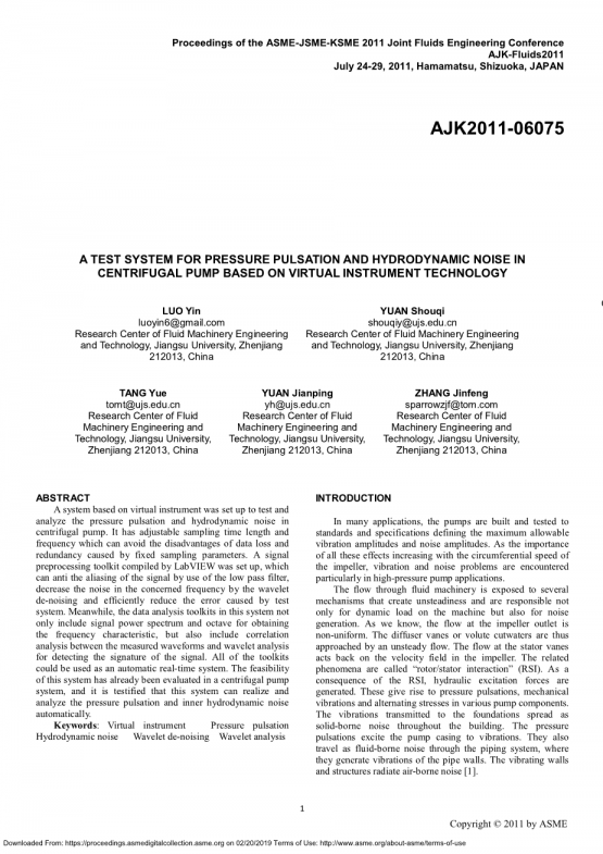 我们建立了一个基于虚拟仪器的系统,对离心泵的压力脉动和水动力噪声进行了测试和分析。 它具有可调节的采样时间长度和频率,可以避免由于固定采样参数引起的数据丢失和冗余的缺点。 通过建立LabVIEW编译的信号预处理工具包,利用低通滤波器防止信号混叠,通过小波去噪降低相关频率的噪声,有效降低测试系统引起的误差。同时,该系统中的数据分析工具包不仅包括用于获得频率特性的信号功率谱和倍频,还包括测量波形之间的相关性分析和用于检测信号特征的小波分析。 所有工具包都可以用作自动实时系统。 该系统的可行性已经在离心泵系统中进行了评估,证明该系统能够自动实现和分析压力脉动和内部水动力噪声。