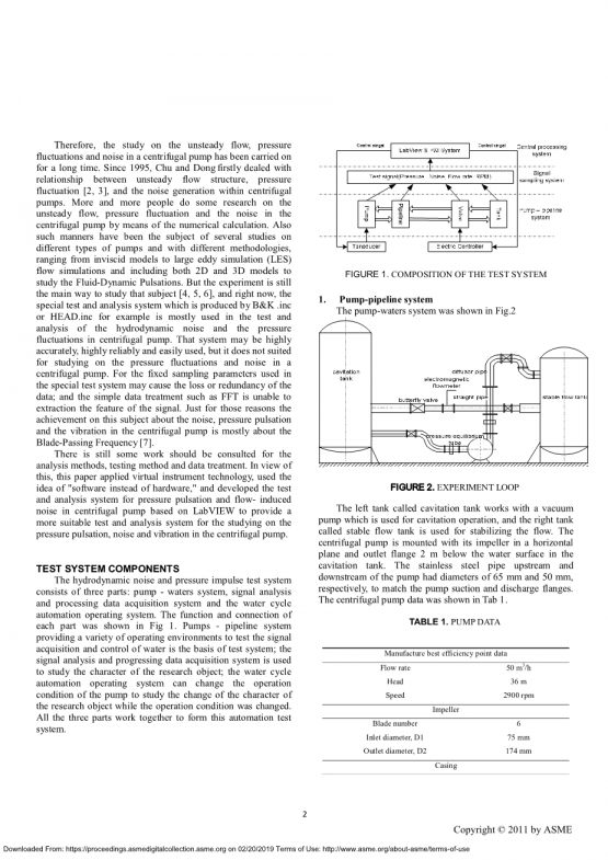 因此,对离心泵中的不稳定流动,压力波动和噪声的研究已经进行了很长时间。自1995年以来,Chu和Dong首先处理了非稳定流动结构,压力波动[2,3]与离心泵内噪声产生之间的关系。越来越多的人通过数值计算对离心泵的非定常流量,压力波动和噪声进行了研究。此类方式也是不同类型泵和不同方法的几项研究的主题,从无粘模型到大涡模拟(LES)流动模拟,包括2D和3D模型来研究流体动力脉动。但是实验方法仍然是研究该主题的主要方式[4,5,6],而如今,由B&K .inc或HEAD.inc提出的特殊测试和分析系统主要用于测试和分析离心泵的水动噪声和压力波动。该系统具有高精确,高可靠性和易于使用,但它不适合研究离心泵中的压力波动和噪音。 对于特殊测试系统中使用的固定采样参数,可能导致数据丢失或冗余; 而且诸如FFT之类的简单数据处理无法提取信号的特征。 正是由于这些原因,关于噪声,压力脉动和离心泵振动的这一课题的成就主要是关于叶片通过频率[7]。